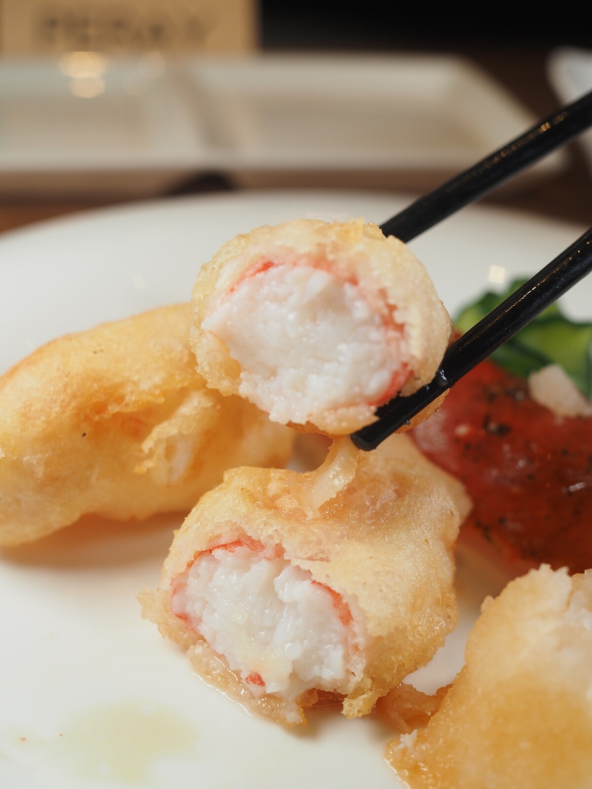 取自日式天婦羅而來的靈感,完整保留蟹肉鮮甜的滋味以及迷人的香氣,使用肥厚的蟹腳前段部位切塊,包裹麵衣後油炸,再搭配蘿蔔泥與中式魚露高湯調製的天婦羅醬汁,甘甜的湯汁,以及清爽的蘿蔔泥,降低了炸物的油膩感。