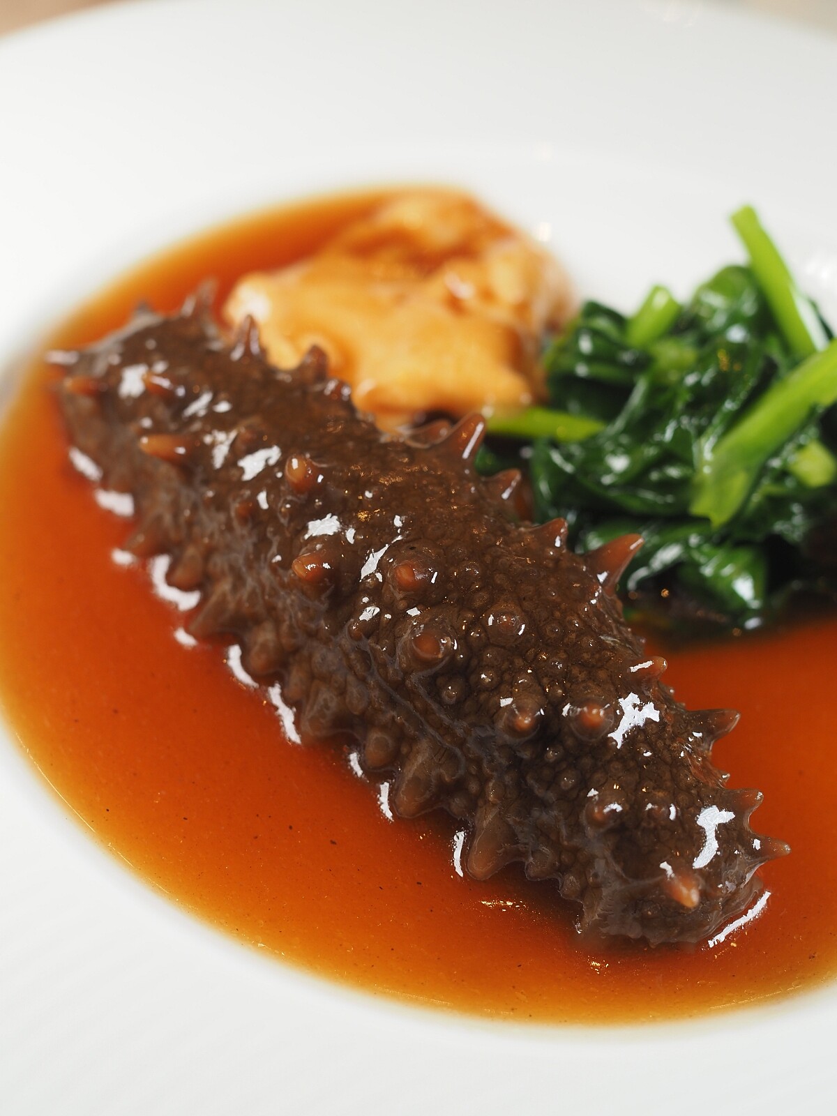 選用來自南太平洋的矜貴花膠,肉質厚實鮮美,搭配的是來自日本關東的刺參,在日本本地近年採季節輪補、配額制等方式來控制捕撈量,因此造就市場價格年年上揚,讓刺參已成為傳說級的食材,其口感韌性十足且彈牙爽脆,需要3至4天的前置工序,再以紅燒燴製,最後送至饕客的餐桌上。