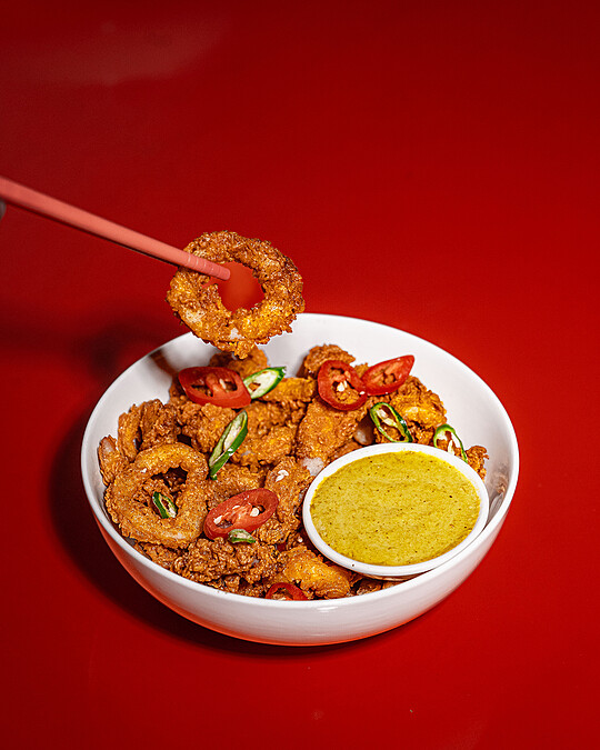 鹽酥雞攤必點的炸魷魚,在週末炸雞俱樂部搖身一變,成為最佳下酒菜;蘸上酸甜微辣的青龍椒醬無比涮嘴。