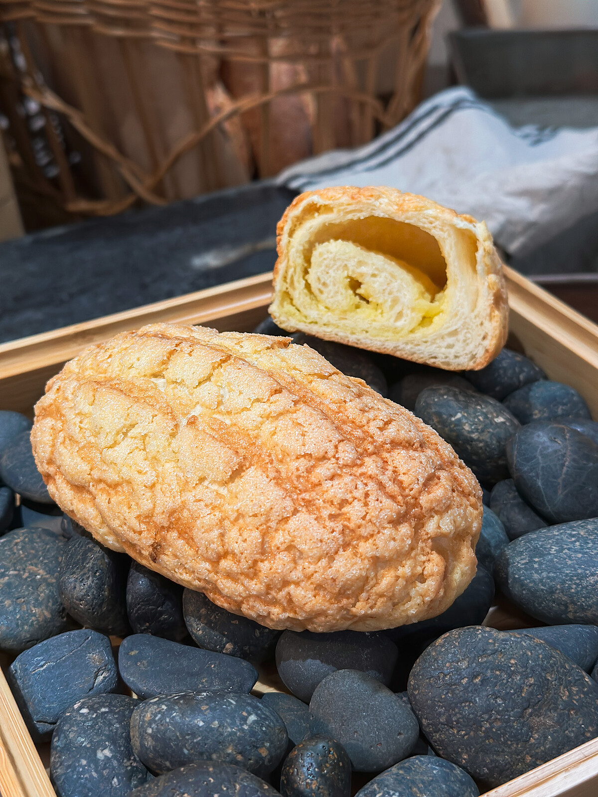 加入石臼麵粉、熊本麵粉,以72hrs低溫發酵製成,咬下的瞬間發出清脆的聲音,伴隨著麵粉香氣與風味,喜愛吃法國麵包的人一定要試試!