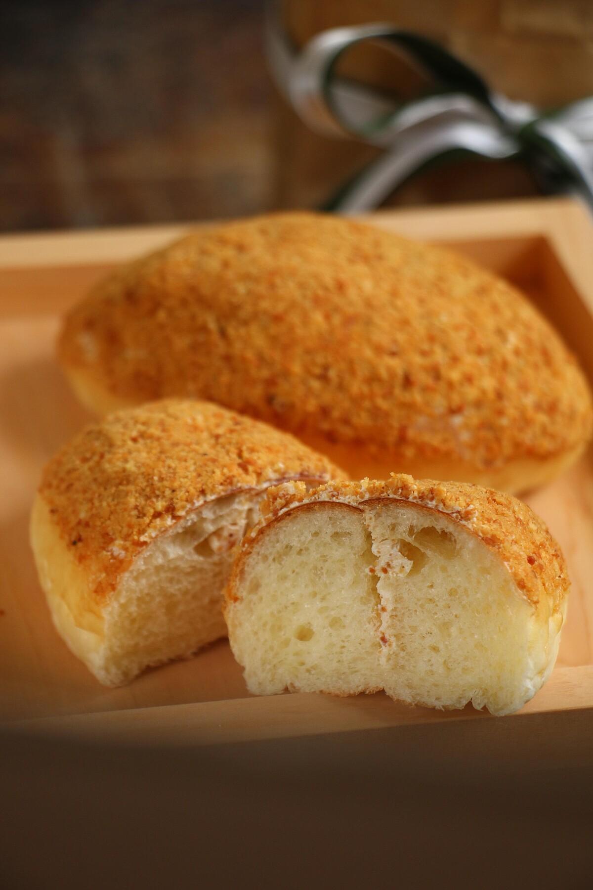 有別於市售的炸彈麵包,陳耀訓為了保持炸彈麵包表面菠蘿的酥脆口感,特別捨去傳統模具,改以手包成形,搖身一變成為橄欖型的外觀,表面的菠蘿皮刻上菱格紋路,外表更似手榴彈,細細品嚐自製奶酥餡與麵包香氣,完全不會過於甜膩,很好吃!