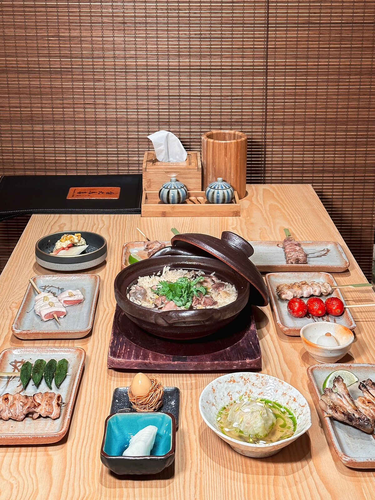 這套「台灣限定雞懷石套餐」透過專業的雞隻分解等部位,提供6串肉類燒鳥與3串新鮮時蔬的組合為基礎,並承襲日本鳥喜的雞懷石料理型態搭配沙拉、前菜、小品料理、食事、汁物、甘味等料理的套餐。