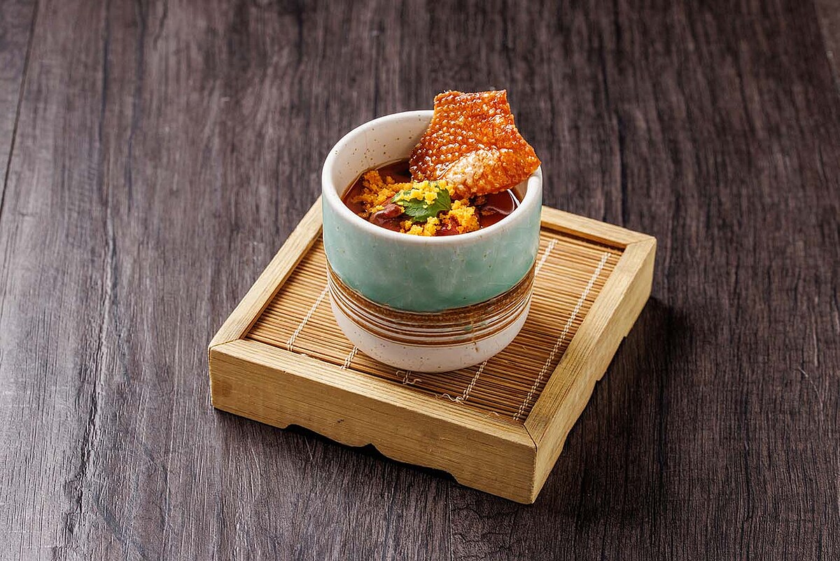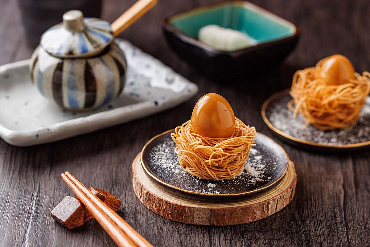 這道菜以炸過的雞絲麵塑造出迷你鳥巢的形狀,鳥巢造型獨特,讓人聯想到鳥禽孕育新生命的情景,再搭配浸泡在酒釀中的溏心鵪鶉蛋,讓整道菜散發出可愛的生命力,吸睛度滿分!