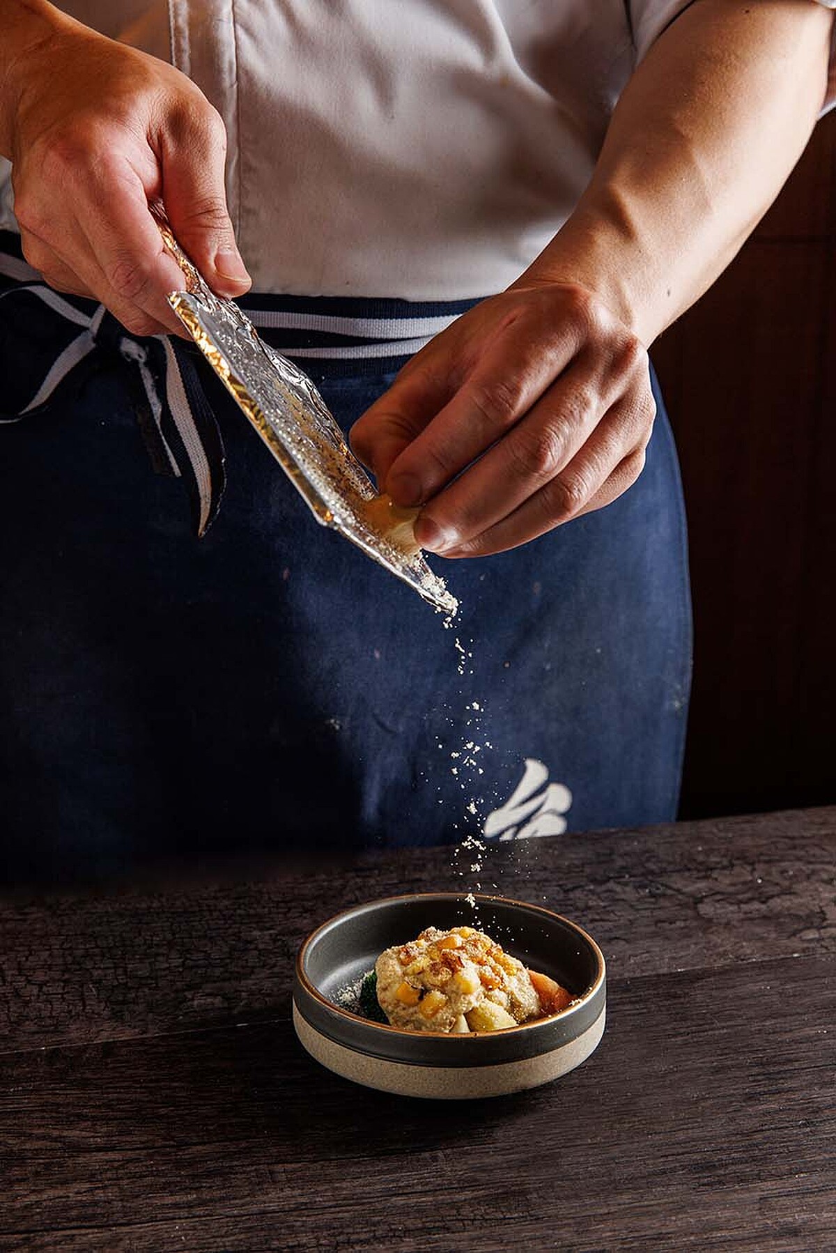 這道料理不僅精緻,而且厚實,為整個套餐增添了不同的風味!「玉米白和溫沙拉」以日本料理經典菜餚「豆腐的白和え」為靈感,使用當日新鮮削下的玉米粒炒香,再混入高湯和豆腐泥打製而成。加入炒香的新鮮胡麻,搭配牛番茄和地瓜等時蔬,再加上現刨的乾高野豆腐,展現出豐富的豆香和鹹香,濃郁的口感令人回味無窮。