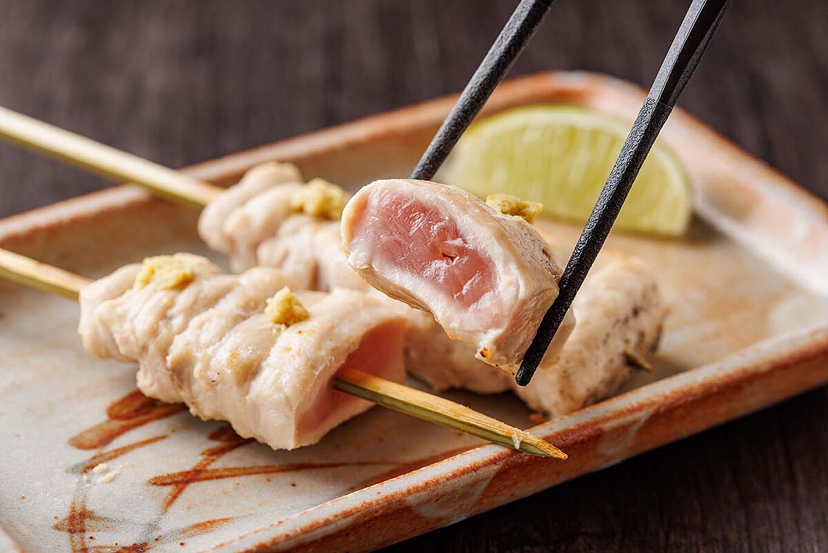 是一道展現雞肉品質的半熟料理,烹調過程必須仰賴師傅的手感與經驗,確保內外熟度。此道料理搭配芥末,入口感受微微刺激感,更凸顯扎實和軟嫩兼具的肉質與鮮甜風味。