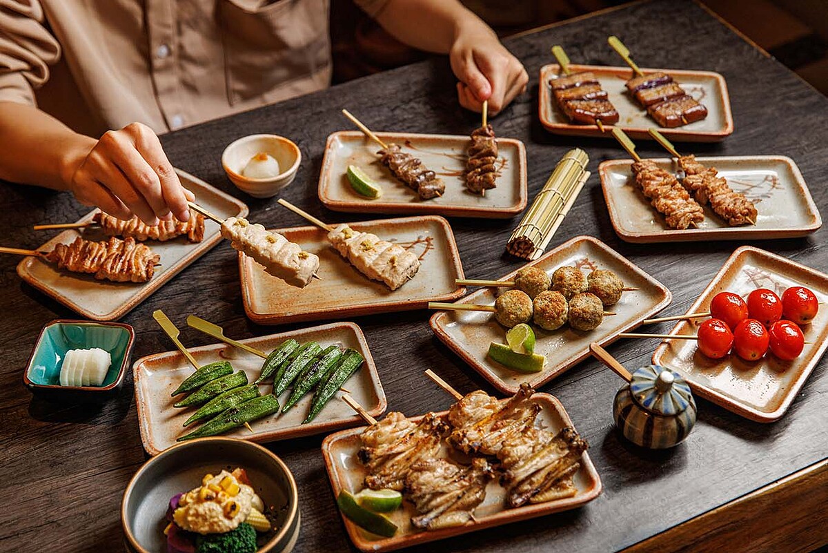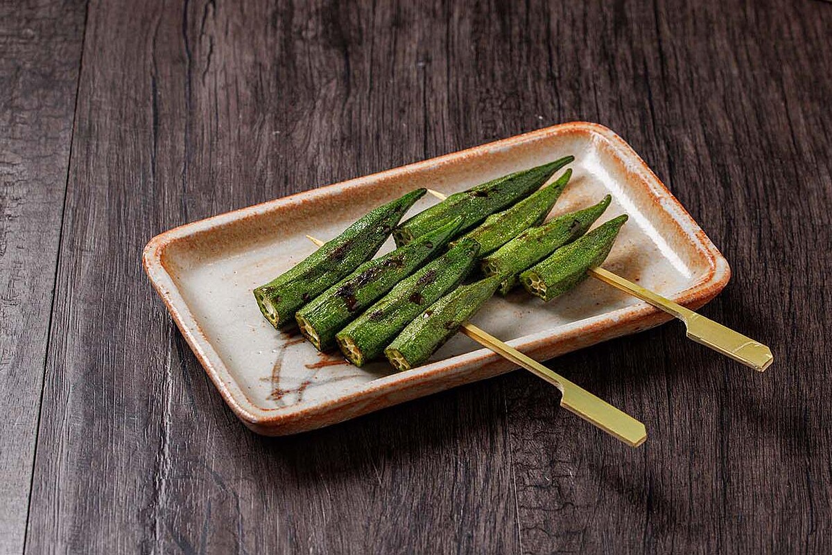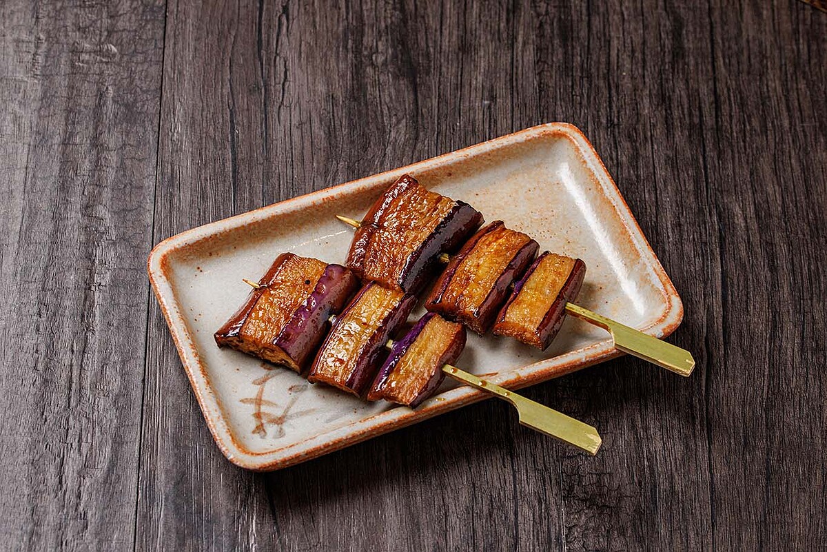 套餐中除了各式肉類燒鳥串外,還有蔬菜串,也有清爽帶特殊口感的烤秋葵、爆汁的烤小番茄、烤茄子等時蔬可品嚐。