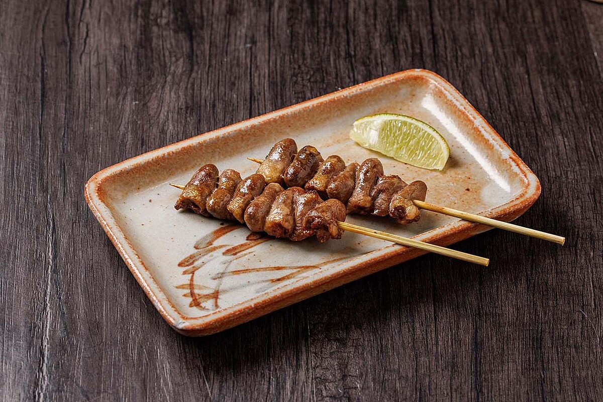 「腿內肉」是串燒中深受老饕喜愛的部位之一,每串需要使用兩隻雞才能串成。這部位運動量較低,油脂豐富,肉質介於緊實的雞肝與Q彈的雞心之間,口感與風味獨特。