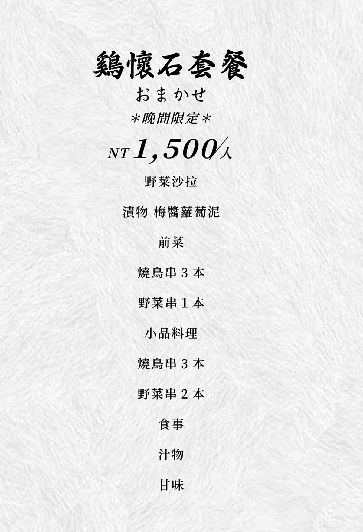 台北鳥喜菜單推薦「台灣限定雞懷石套餐」價格:NT$1500(僅晚間提供)