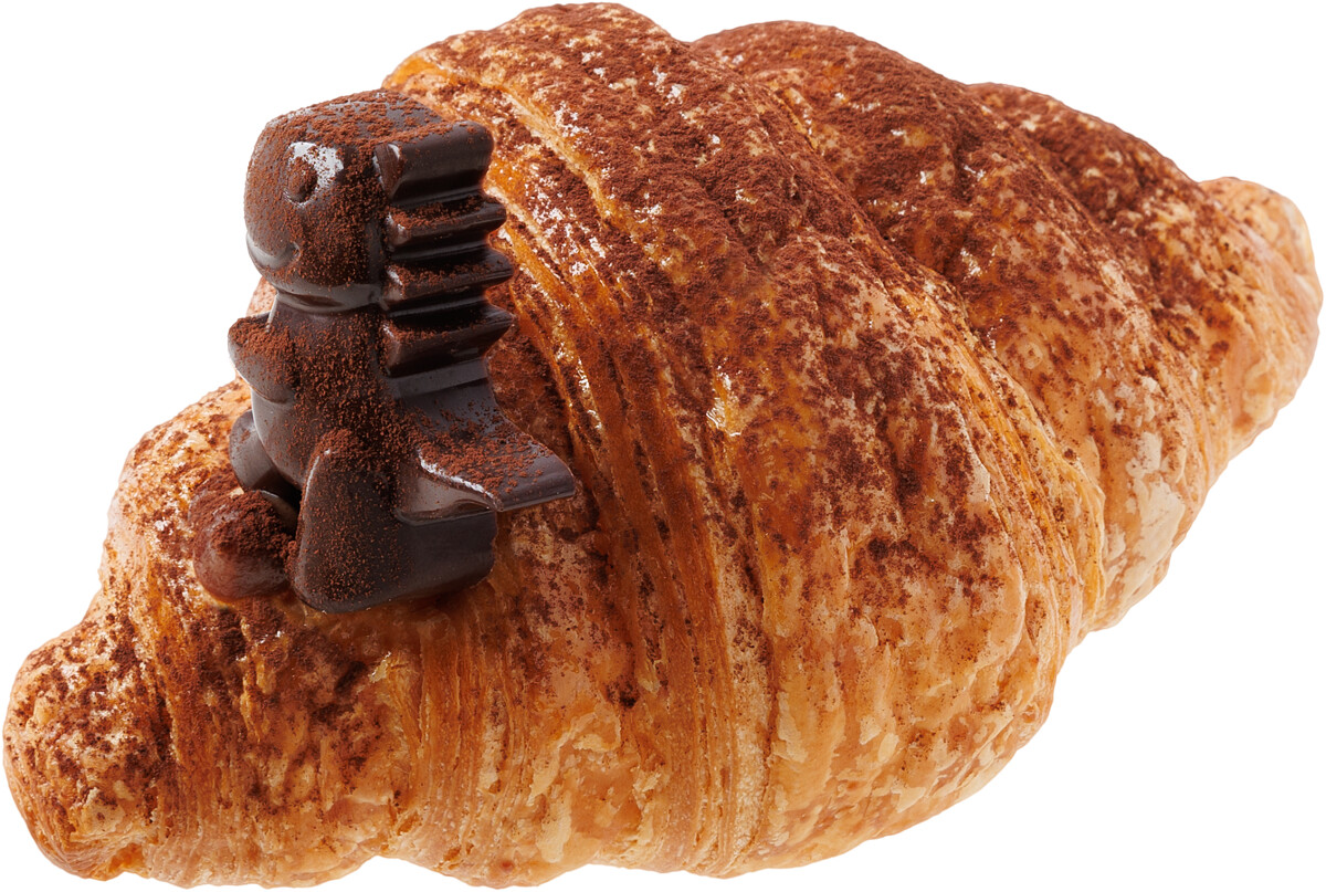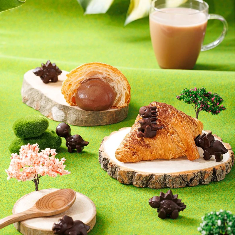 在金黃酥脆的可頌中加入了美祿麥芽巧克力卡士達,多層次的口感,與甜而不膩的滋味,每一口都超療癒!此外,可頌上的恐龍巧克力共有4款造型,隨機販售,等著大家來蒐集!