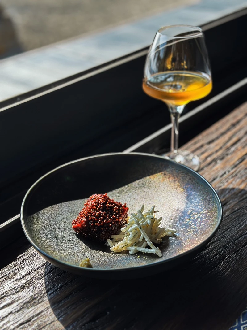 首先會在日式庭院中的藍花楹樹下帶領饕客「上山下海」!首先端上桌的是宛如日式豪華便當般的「先付」集結了生蠔、車蝦青花筍、金山寺冰頭與冬季時蔬…等食材,再搭配帶有果香口感溫潤的烏龍茶,以及二胡演奏,替這場《飛花落院》茶餐會揭開序幕!