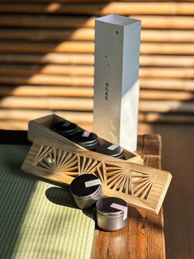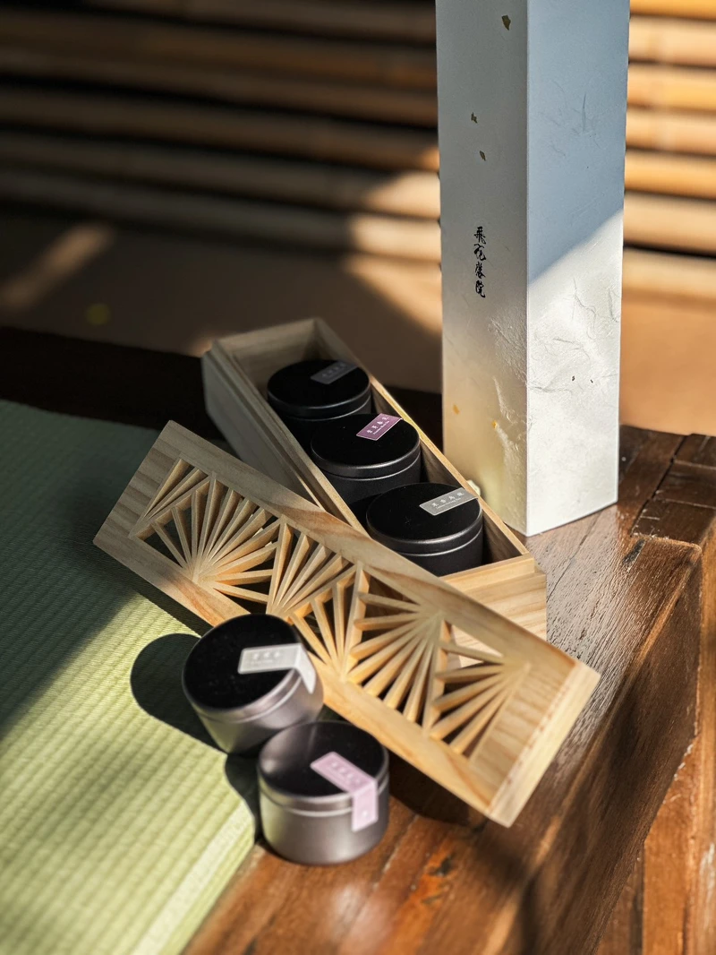 飛花落院的「五大製茶師金選-旭日東昇」茶葉禮盒外和也富有巧思設計,特別找來了日本木製窗花第二代傳人陳正忠及陳建利兄弟手工打造,茶葉外盒十分精緻,盒子的線條宛如太陽東昇的旭日,也如同在「飛花落院」體驗到的日出和日落。