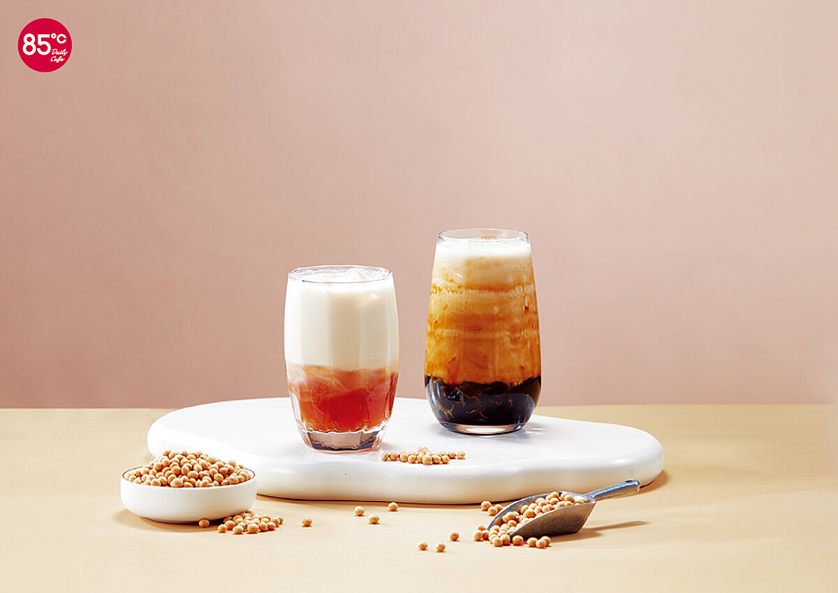 豆漿被譽為「植物界的牛奶」,富含蛋白質、膳食纖維與其他營養素,且和牛奶相比,無糖豆漿的熱量更低!這次85℃推出兩款香濃豆漿系列飲品,「黑糖珍珠豆奶」和「豆奶紅茶」,以100%新鮮黃豆萃取的無糖豆漿為基底,搭配錫蘭紅茶和Q彈珍珠黑糖珍珠,每一口都能感受到豆漿的濃醇滋味!
