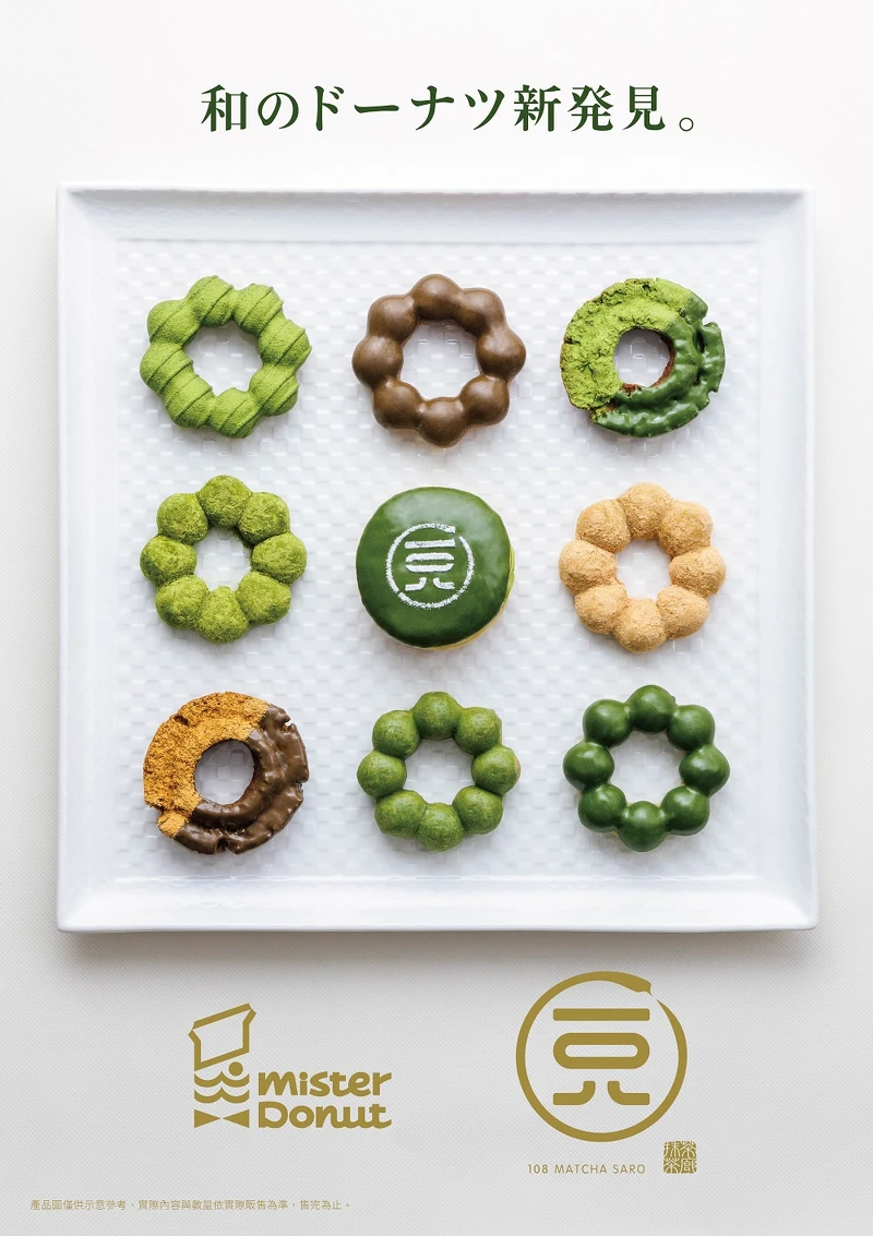 Mister Donut與超人氣的抹茶甜品專賣店「一〇八抹茶茶廊」再度聯名啦!這次不只以抹茶與焙茶的「雙茶」核心,更將一〇八必吃的「大判燒」及「蕨餅」作為概念推出全新甜點,打造豐富的雙茶日式甜點饗宴,共有9款甜甜圈與甜點,為春天增添一份甜蜜滋味,抹茶控真的必須吃爆!