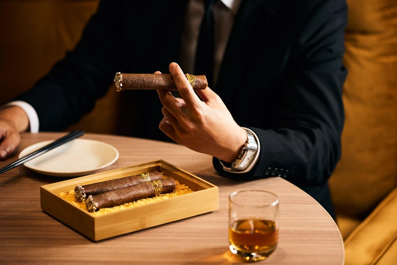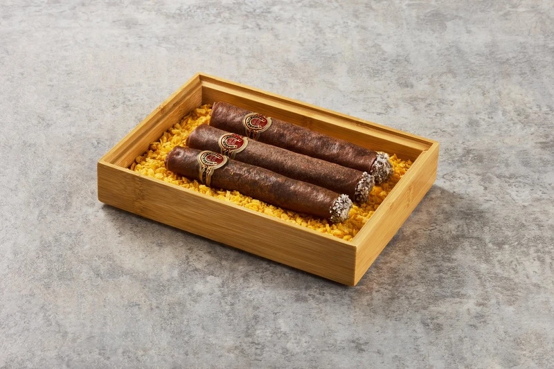 「剁椒臭豆腐雪茄卷」製程其實相當重手工,將本地的臭豆腐與切碎的剁椒、蒜泥和料酒拌勻,再捲入以可可粉調色的春捲皮,慢炸後用米漿糊黏貼標籤紙,最後沾裹蜂蜜煙蒂(椰絲)後裝入盒中,成品如同真正的雪茄一般,口感酥脆不油膩,香辣味道十分美味!