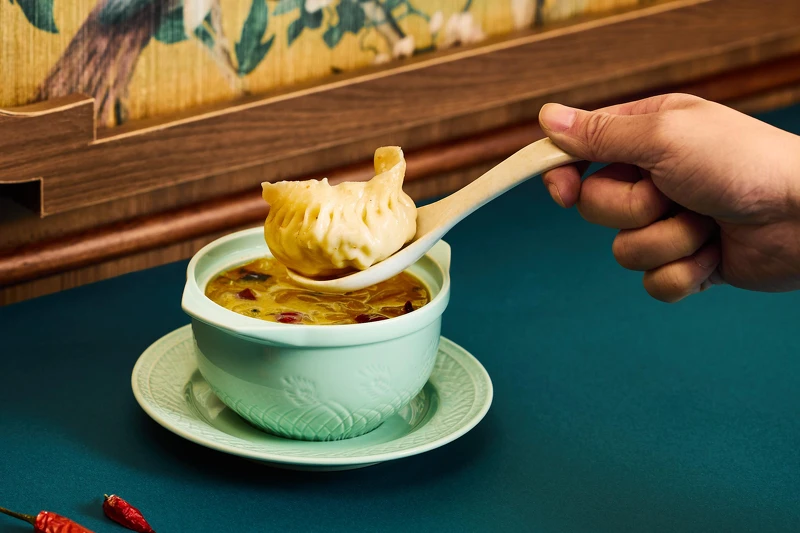 酸菜魚灌湯餃是四川重慶名菜,其鹹鮮酸麻的滋味在90年代開始風行,現在已經被許多台灣老饕所熟知!而樂天皇朝的研發主廚將這道名菜改良,做成了適合單人享用的灌湯餃。採用燙麵製成的餃子皮,內部包裹著客家酸菜和鱸魚菲力,蒸熟後置於碗盅中,並倒入經過煸香酸菜和青花椒提味的豬骨湯,讓湯汁灌入餃子中,皮滑餡鮮,光看圖片就讓人口水直流!
