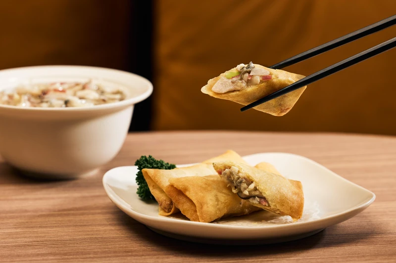 宋嫂魚羹是杭州名菜,據《武林舊事》記載已有800多年的歷史。原始做法是蒸熟去骨的鱖魚或鱸魚剁碎後加入筍絲、香菇絲、火腿絲等材料一起勾芡,湯清味美,被譽為能與蟹黃羹一較高下的湯羹。樂天皇朝的「宋嫂魚羹春捲」創新經典,將鱸魚肉與筍絲、火腿絲、香菇絲爆香後加雞湯燴煮,勾芡,待涼後包成春捲炸至金黃酥脆。趁熱品嘗,鮮美的雞湯滋味在口中四溢,酥脆的外殼和香嫩的內餡相得益彰,是一道令人垂涎欲滴的美食。
