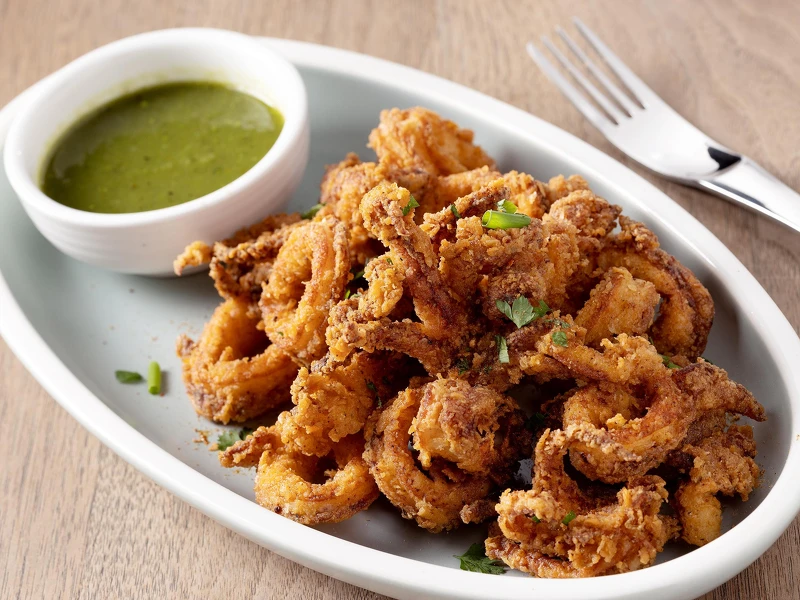 將花枝裹上特製起司酥炸粉炸至金黃酥脆,再搭配微辣清爽的綠莎莎醬,其中綠辣椒和香料帶來層次豐富的辛辣味,而檸檬的酸度則是點綴出花枝的鮮甜滋味!