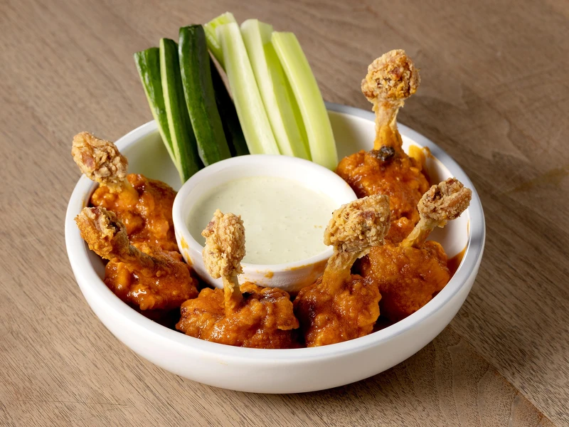先將雞翅腿處理成棒棒糖的形狀,便於食用。再以水牛城辣醬的醃漬,讓肉品辣勁十足更入味。再佐以墨西哥鄉村醬,酸奶美奶滋平衡辣度,配上清爽可口的小黃瓜和西洋芹,非常開胃,讓人忍不住一口接一口!