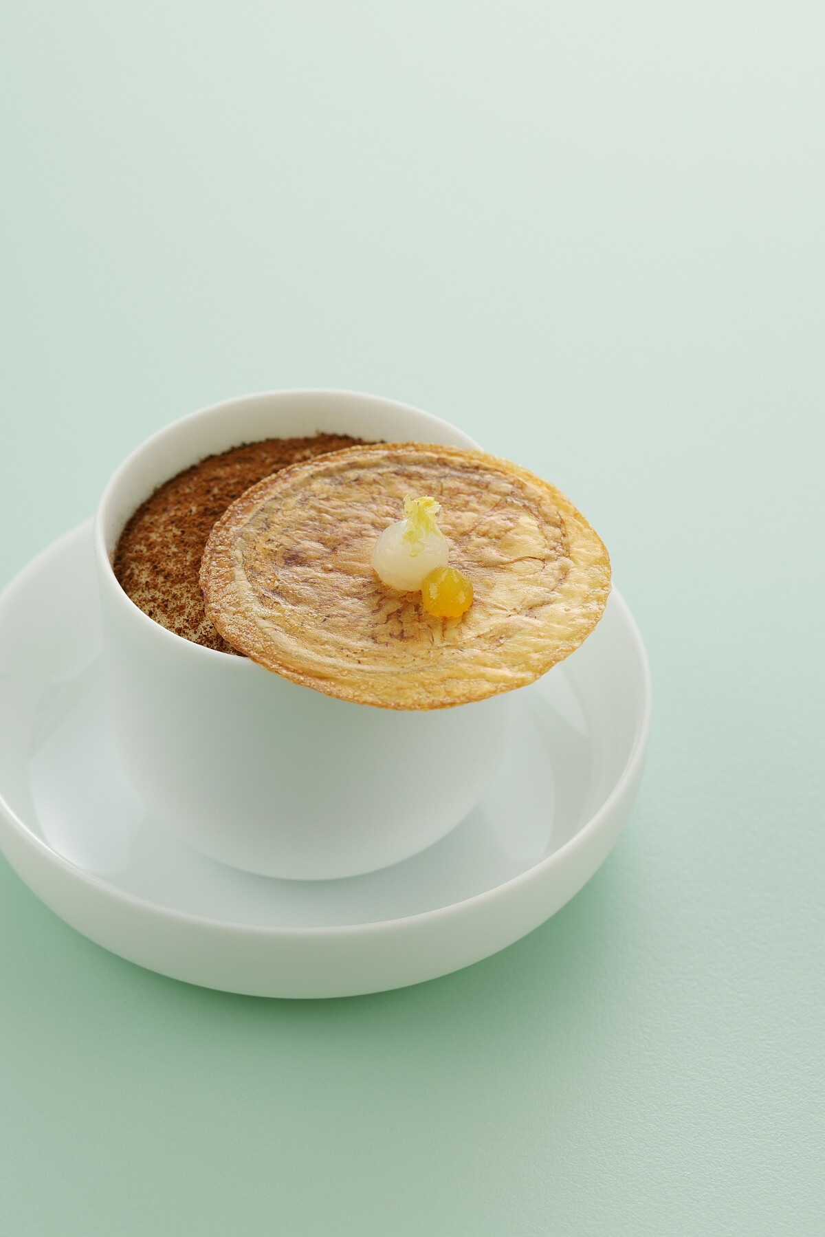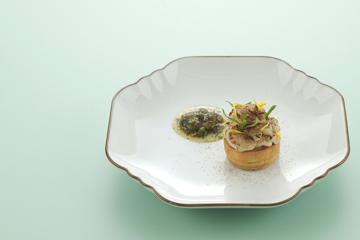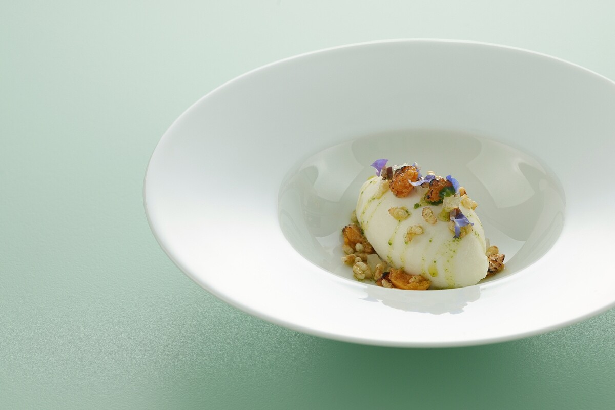 挑選初春代表經典食材鱈魚白子,用塊根植物菊芋做成quiche,以森林的泥土香氣來呼應白子的濃郁,一點山葵的辣嗆讓甜美更具層次;醬汁將焦化奶油拌入檸檬、酸豆以及香草。廚藝總監陳嵐舒優雅結合了經典與個人細膩風格:「簡單炙燒帶出純淨的乳香。用塊根植物菊芋做成鹹派 quiche,以森林的泥土香氣來呼應白子的濃郁,一點山葵的辣嗆讓甜美更具層次;Grenobloise 醬汁則是重新演繹經典,將焦化奶油拌入檸檬、酸豆以及巴西里香草。」 白子跟菊芋都是冬天尾聲到早春時的食材,白子簡單炙燒帶出純淨乳香。