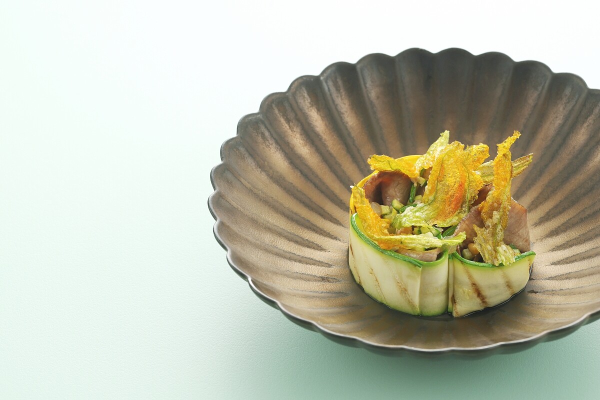 牛舌刨成薄片並炙烤,與炭烤櫛瓜片疊層捲起,撒上拌炒切丁櫛瓜、乾蔥、蒜頭與松子增加堅果香氣;底部鋪上充滿香草氣息醬汁,讓人感受到春天的清新綠意;上方點綴炸櫛瓜花,搭配松子泥以及牛舌高湯凝膠。此道為菜單中味覺轉折,透過炙燒拉高陽剛滋味,也鋪陳迎來下一道主菜。