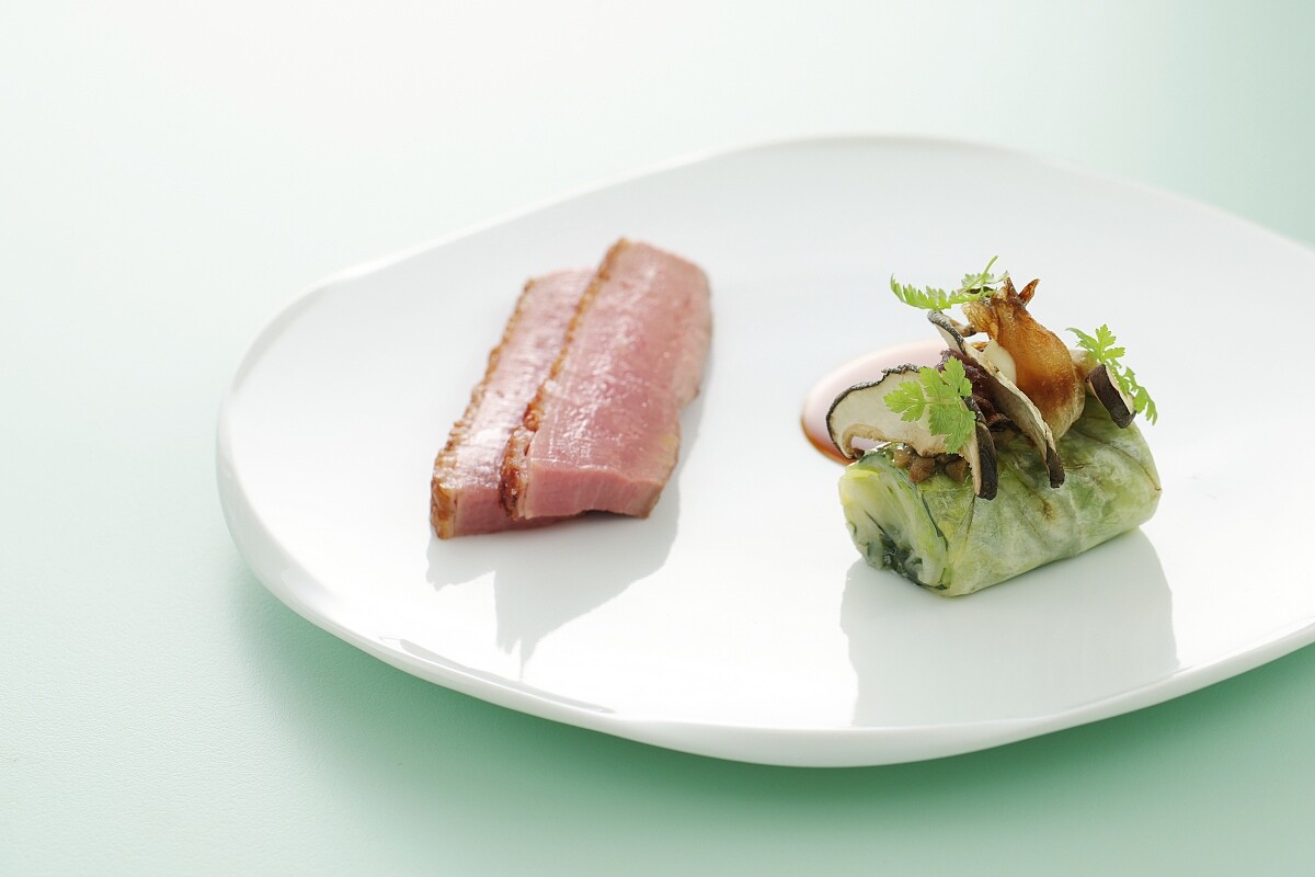 廚藝總監陳嵐舒為玫瑰玉露鴨胸,做了異國風情的精心調配,鴨胸要以無花果葉包裹炭烤乾式熟成七日,讓無花果葉椰子香氣沾附於鴨肉上,強烈又溫潤還能感受到熱帶島嶼的異國風味,接著將炙燒過的甘藍菜淋上香料鴨油,層層捲起薄荷、巴西里香草,成為甜美而汁水淋漓的蔬菜。上面層疊以鴨肝、鴨胗、野菇與肉汁燴炒的肝醬,以及炸酥的紅蔥頭。