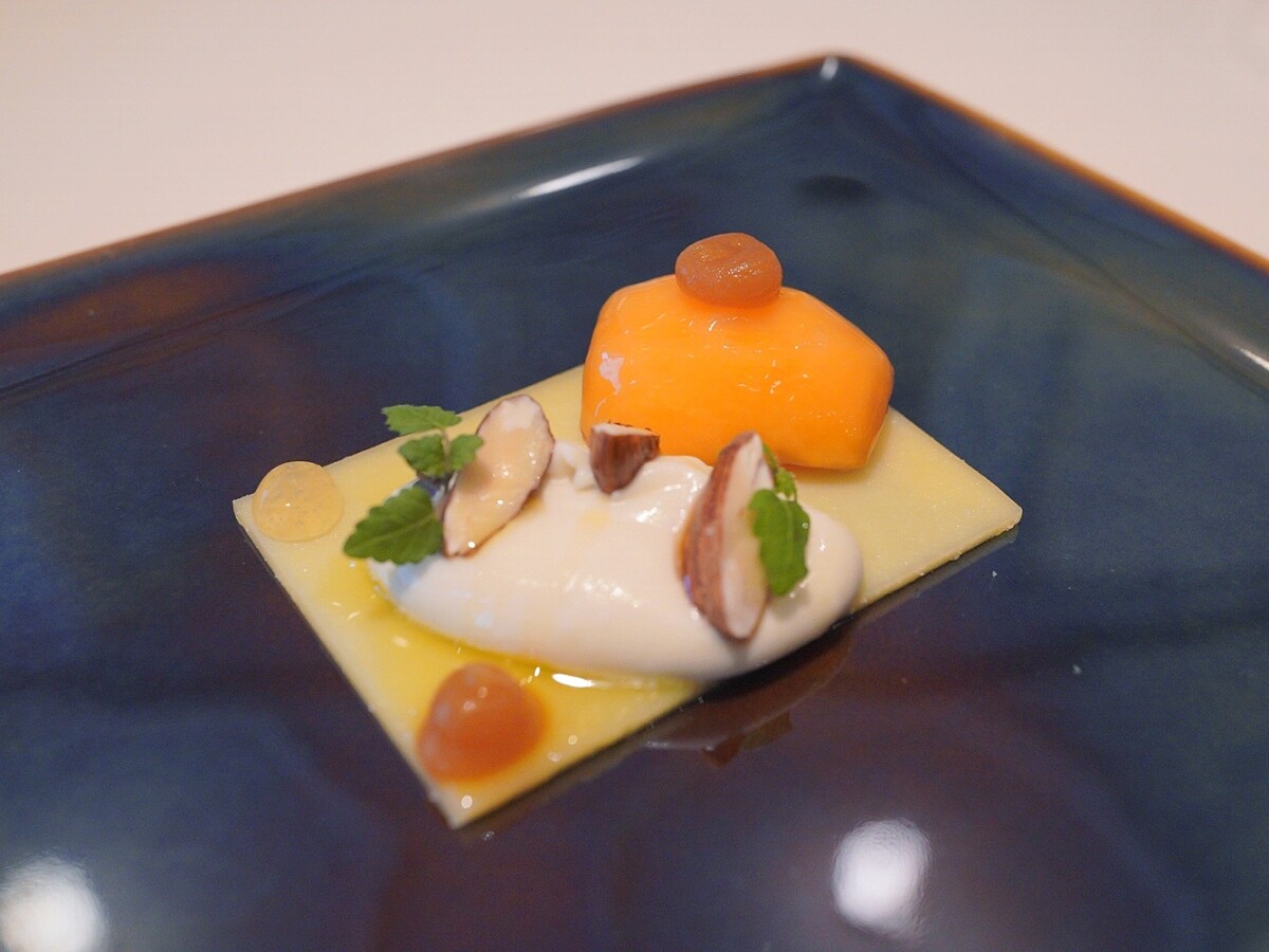 展現細膩的氣味搭配,選擇季節限定且珍稀枇杷為Pre dessert,選用嬌貴的枇杷裹上小米酒果凍,一旁則是桂花微甘苦的芳香做成香緹,搭配上太妃、堅果風味的法國波弗乳酪薄片。幾點煙燻杏桃泥、新鮮枇杷果泥則是品嚐乳酪時畫龍點睛的酸甜燻香。