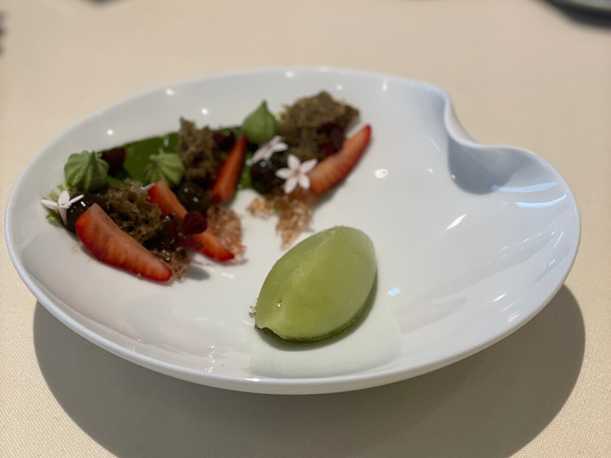 主體為紫蘇雪酪,佐抹茶幕斯琳奶油霜,和馬約蘭烘烤再研磨成粉成為海綿蛋糕,新鮮草莓,馬約蘭白玉麻糬球。點綴草莓香甜酒晶凍與抹茶瑪琳蛋白霜。和酢醬草繁星花點綴。是一道用甜點清新的香氣及視覺上的綠意表現春天到來的菜品。