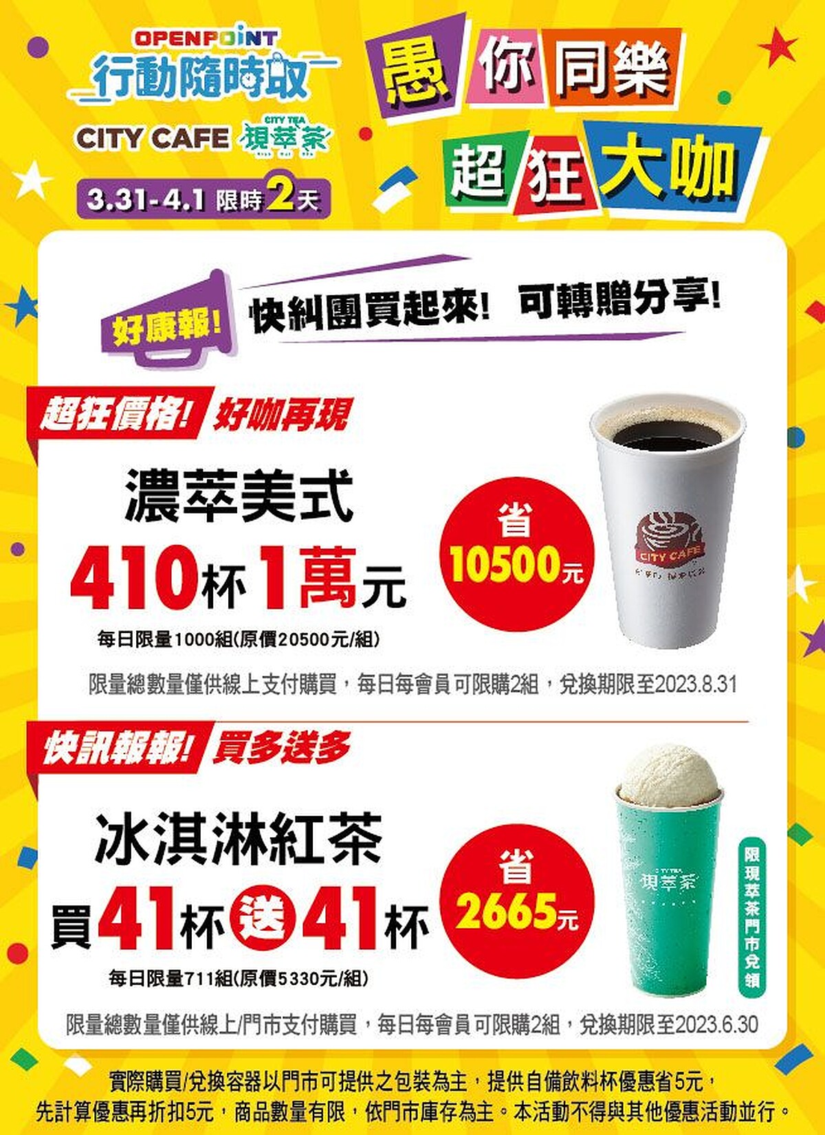 7-11連假優惠2、愚人節APP限定優惠,OPEN POINT APP行動隨時取推出「濃淬美式410杯1萬元」、「冰淇淋紅茶買41杯送41杯」