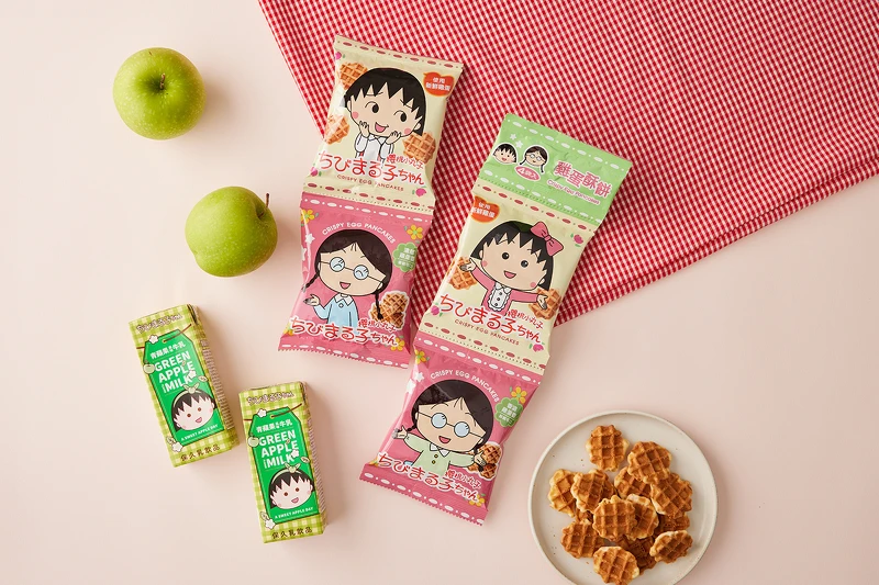 採用新鮮雞蛋製作的「櫻桃小丸子雞蛋酥餅」,同樣以四小包的串包販售,把歐式鬆餅變成酥脆的餅乾,每口都能品嚐到酥脆可口的香濃蛋香,再搭配小丸子青蘋果風味牛乳就是最佳的下午茶解饞組合啦!