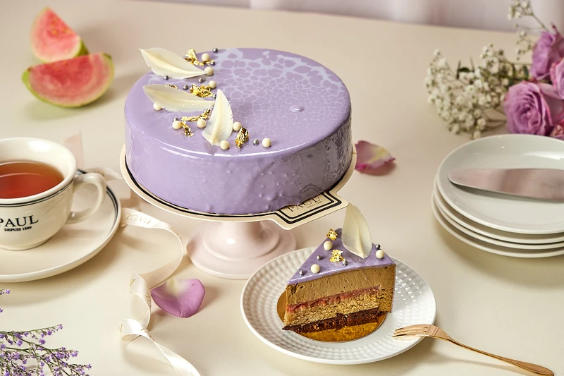 擁有浪漫紫色,給人沉靜典雅感受的「傾馨美人」,茶韻、果香層次多變,味蕾層次絕對滿分!PAUL以東方美人茶為主軸,從東方美人海綿蛋糕到東方美人慕斯,結合在地食材——紅心芭樂做成的果凍為中間夾層,在茶香韻味中帶點紅心芭樂的酸甜,底部的巧克力脆餅,增加層次風味,畫龍點睛,無論視覺、味覺都值得獻給最美麗的母親,滿滿的幸福溫暖感。