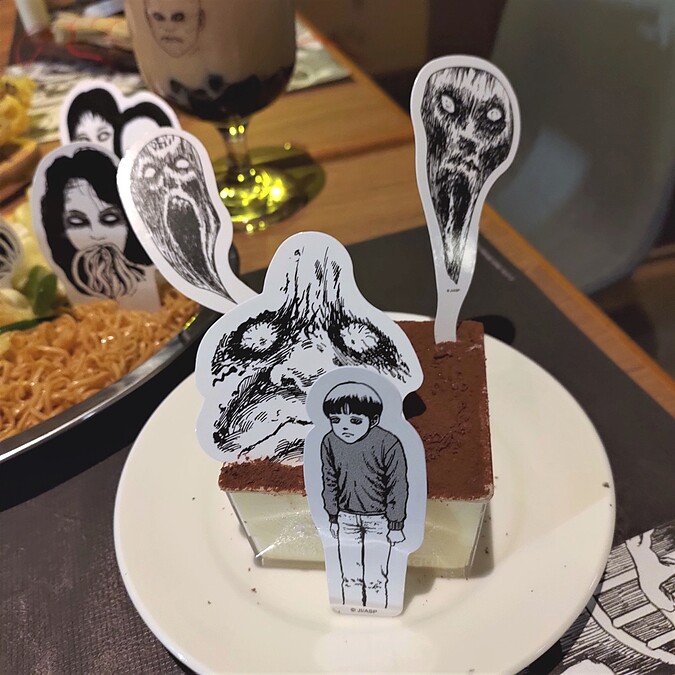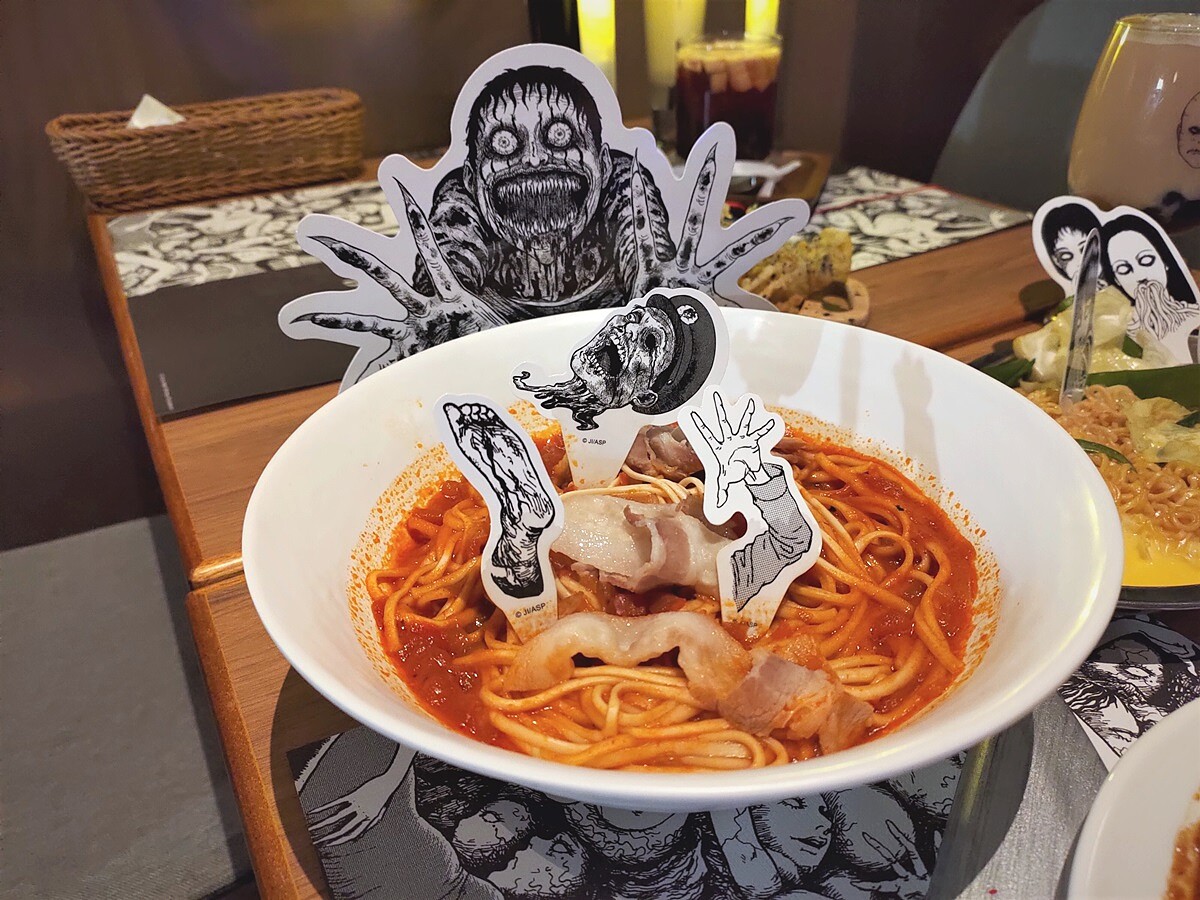 這次聯名除了讓人驚嚇十足的餐點外,連店內用餐環境也化身成黑白漫畫風場景,為了重現壓抑詭譎的氛圍,餐廳中也特別布置了許多經典場景,像是童年的噩夢「人頭氣球」,群眾為富江發瘋癲狂的場面,《歐拉歐拉オラオラ》將帶領大家進入伊藤潤二的世界中,伴隨著陣陣涼意,究竟是冷氣還是?準備好約好友們一起去試試膽量啦!