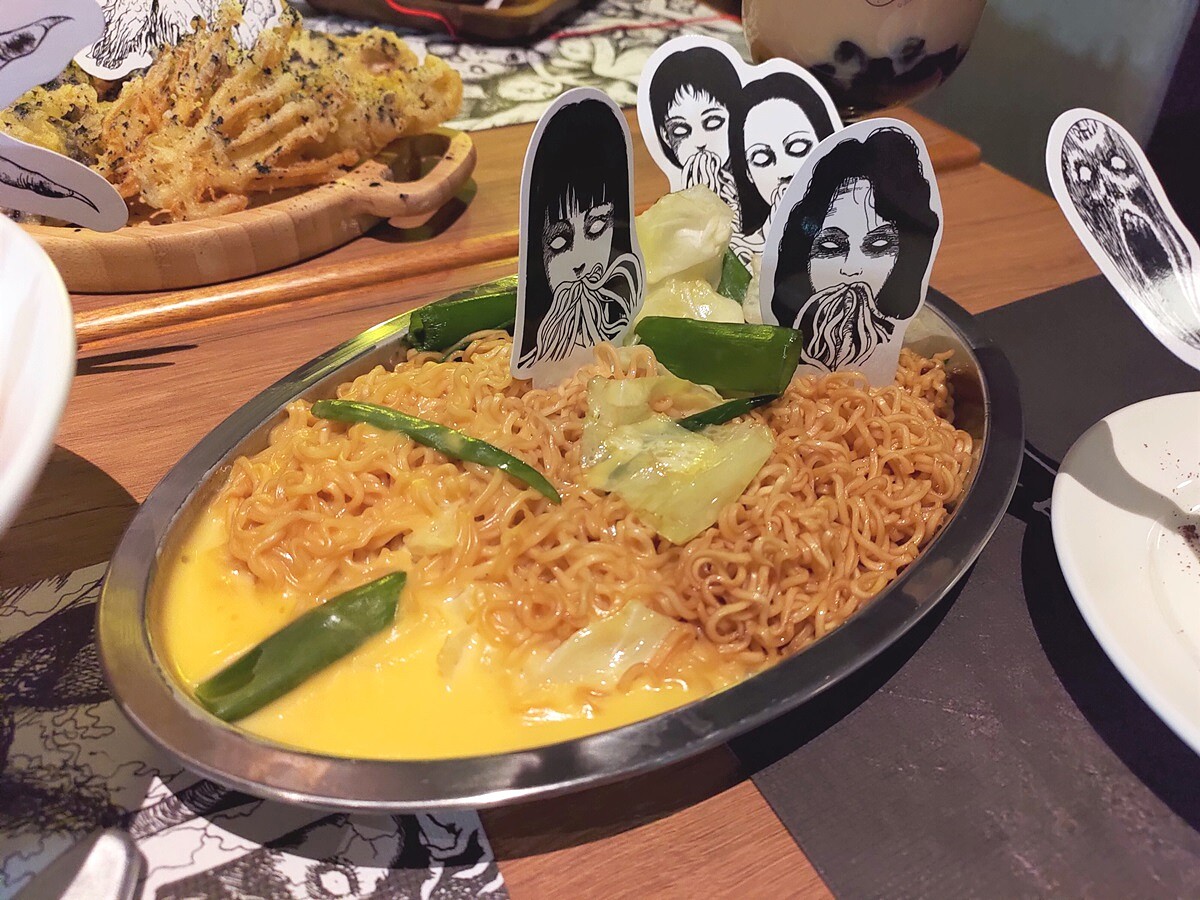 主餐的部分則有張著血盆大口的「敏三血腥拉麵(蕃茄起司拉麵)」、團體病房中的「連體炒泡麵」、以及浮現富江頭的「富江燉肉燴飯(紅酒燉牛肉燴飯)」。
