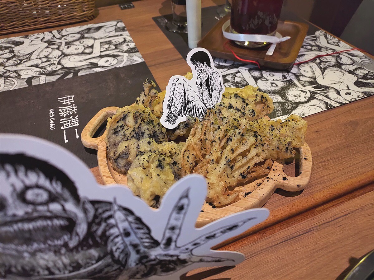 歐拉歐拉與伊藤潤二聯名的餐點靈感來自由「富江」、「雙一」等人氣經典篇章設計而成,共有3道主餐、3種甜點,以及6款特調飲品,主餐與甜點皆有精美裝飾插卡,甚至還附有小道具神還原,聯名餐點除了可口外,也還原了「伊藤潤二」的恐怖氣氛,想來用餐的客人記得先做好心理準備阿!