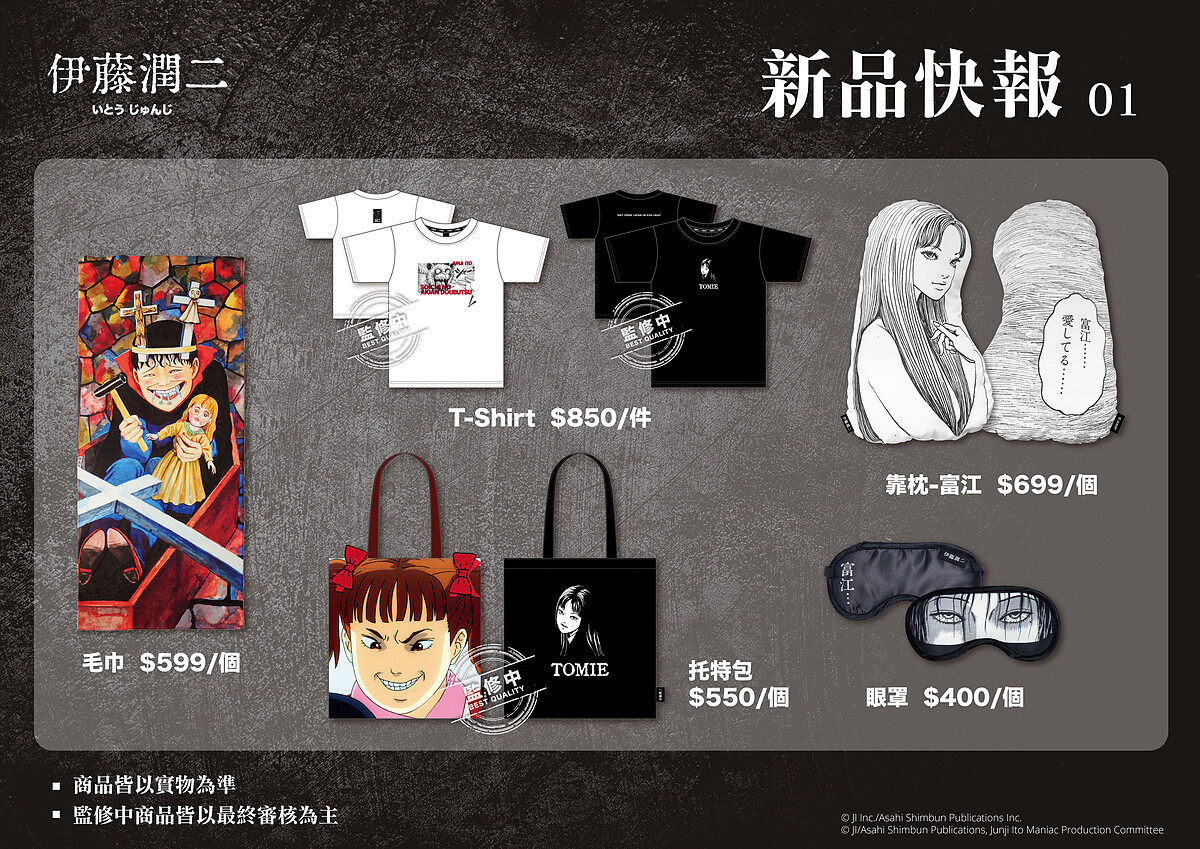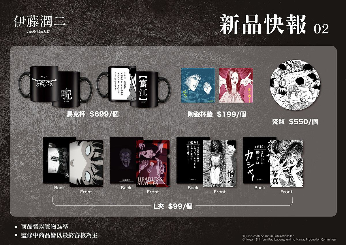 除了聯名餐點外,在《歐拉歐拉オラオラ》餐酒館現場還有販售、預購「伊藤潤二」全新系列獨家周邊,這次「歐拉歐拉オラオラ」與「FANFANS粉粉」合作,設計一系列讓人恐怖又充滿質感的驚喜正版商品,從富江靠枕、雙一毛巾、地墊、下詛咒的馬克杯、靈異杯墊、雙一日記筆電包...等,還有童年噩夢大集合的L夾、立牌等實用週邊,真的讓人忍不住想「剁手」收藏阿!除了現場可以購買外,這次的系列新品也能於「FANFANS粉粉」官網入手,喜愛「伊藤潤二」的粉絲們千萬別錯過啦!