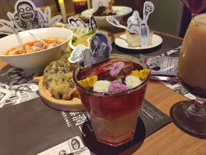 這6款特調飲品的靈感取自不同的恐怖篇章,分別有集體為富江美貌痴狂「富江是我的!(酒精飲料)」、肉色的妖怪「肉色小孩(伯爵茶奶霜鮮奶茶)」、吸血之闇「血液葡萄酒」、黑衣美少年的「美少年調酒」、「友樹的朋友(紅芭樂草莓冰淇淋汁)」、以及用蠟燭和稻草人裝飾,吸睛度爆表的「詛咒的紅酒」,感覺喝完就會遇到富江阿!