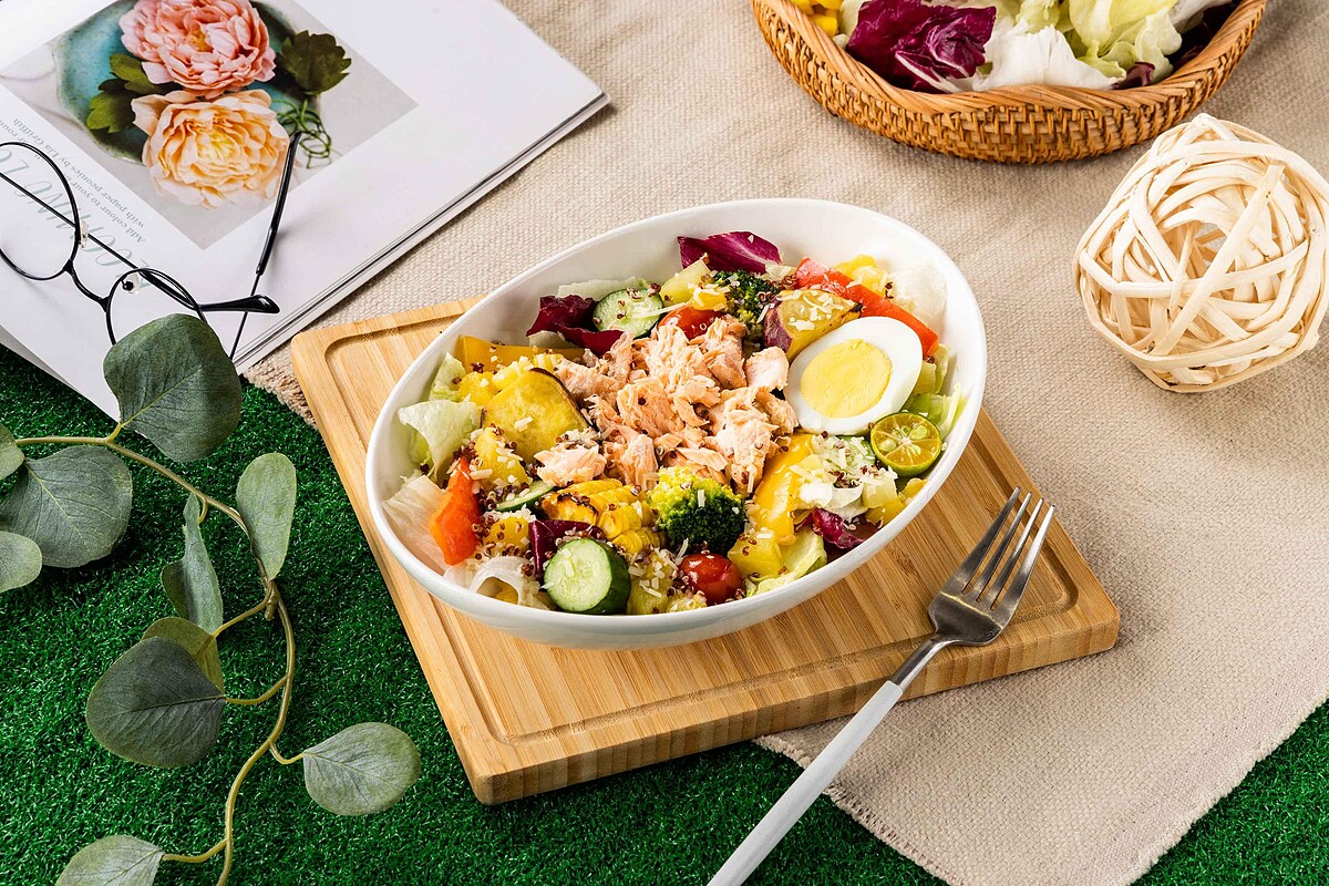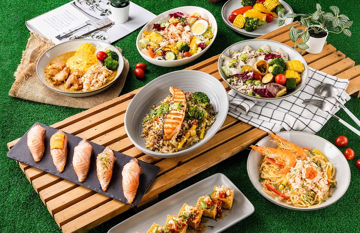 由美威五星研發團隊研發的絕佳餐點。將多種色彩繽紛的時令蔬菜像是鳳梨、紅黃椒、小番茄、青花椰菜、栗子地瓜和小黃瓜等經過輕微烤製後,搭配主廚特製的檸檬香油醋調味,再加入蒜香四溢的手撕鮭魚、營養豐富的紅藜麥,讓大家輕鬆攝取豐富的Omega-3和膳食纖維,同時增加開胃口感。