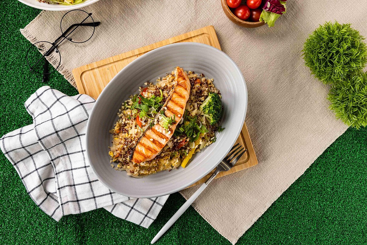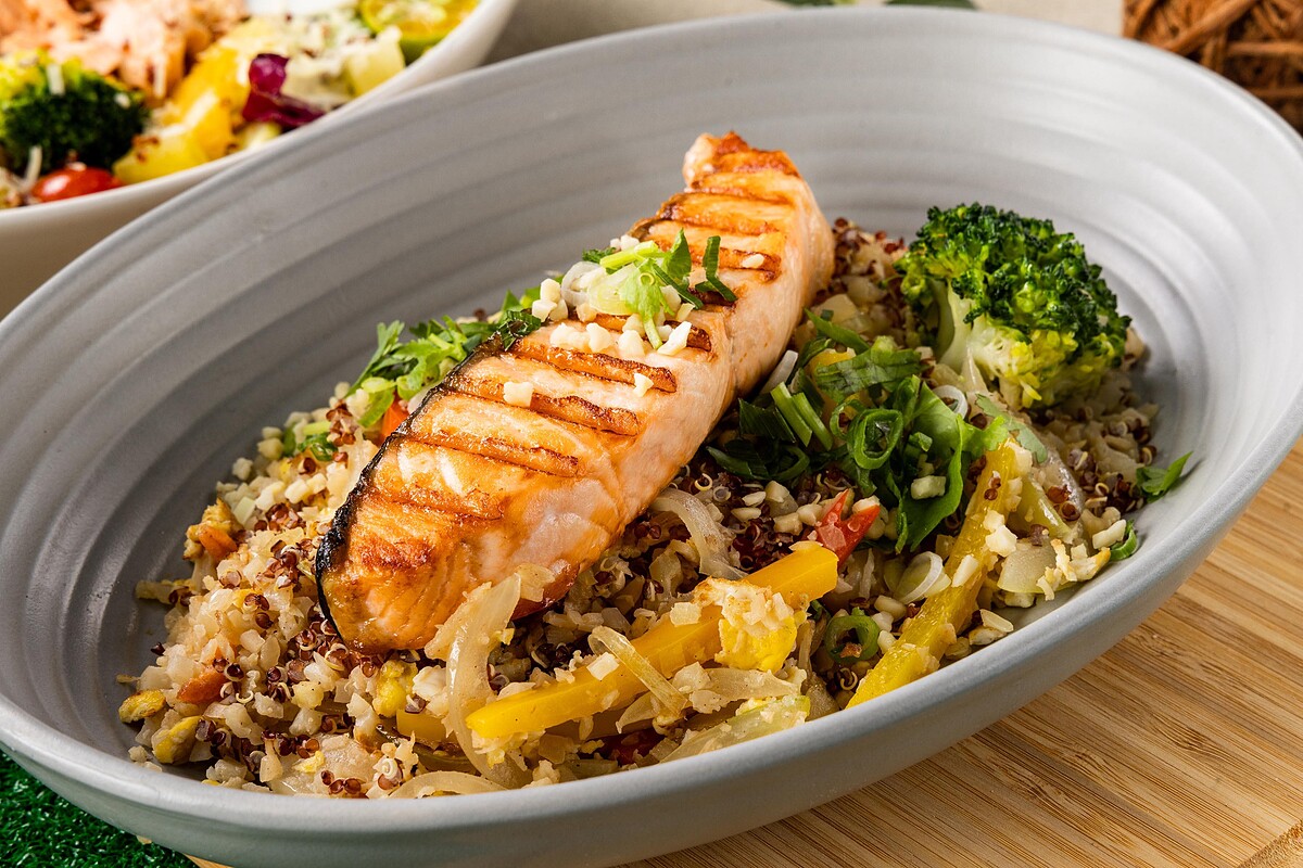 此外,厚切嫩烤的鮭魚菲力、紅藜麥、紅黃椒和雞蛋等新鮮食材搭配白花椰米,味道清新、健康美味。相較於米飯,白花椰米熱量減半,讓人吃得飽足又不擔心增加熱量。這道低醣「偽炒飯」適合運動健身或注重身材的人食用,是一道絕不能錯過的美食。