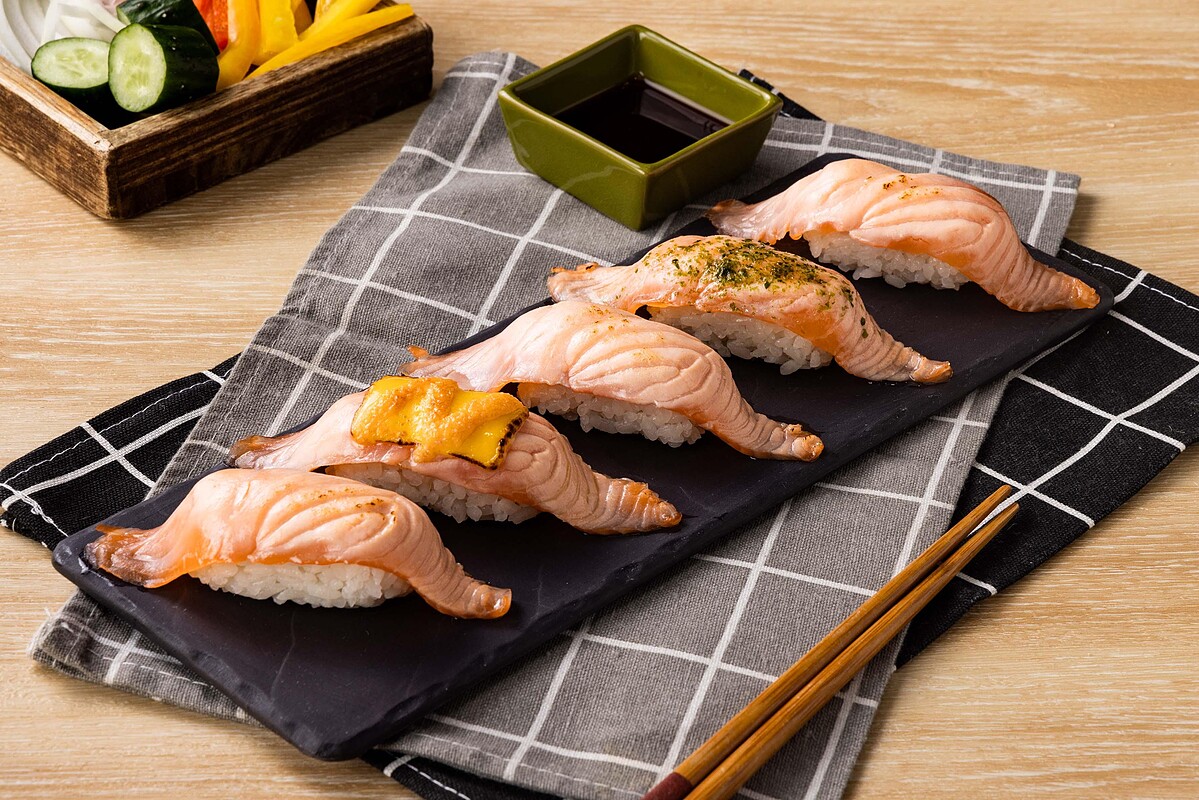 採用挪威直送的生食級新鮮鮭魚,經過焦糖炙燒和海苔粉點綴,讓每一口都能感受到金黃微焦的外層和咬勁十足的口感。此外,更融合了鮮嫩鮭魚、香濃起司和鮮甜明太子美乃滋,入口感受多層次的美味。