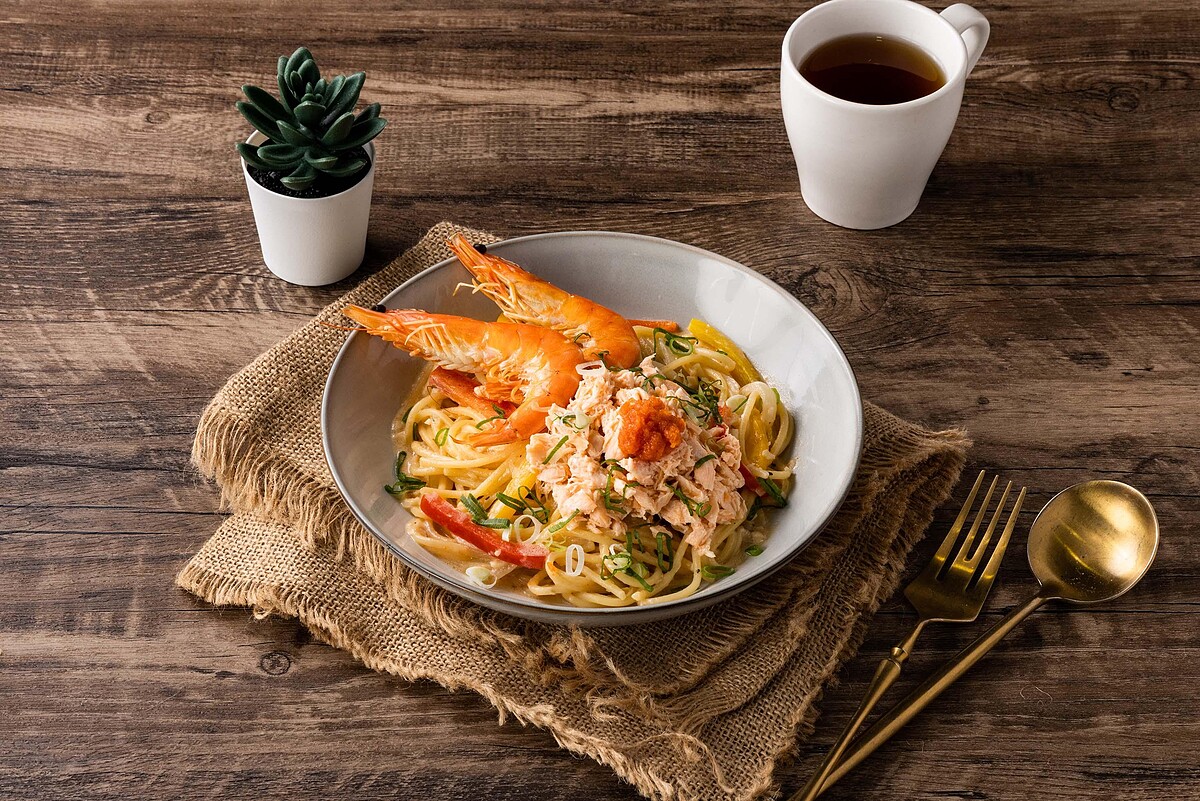 以歐洲進口橄欖油炒香蒜頭、洋蔥,加入紅、黃甜椒,再以義式經典香草醬調味,融合鮮奶油、帕馬森起司和日本進口明太子,搭配Q彈有嚼勁的麵條,接著加入新鮮手撕鮭魚和鮮蝦,一口咬下感受濃郁奶香和微辣鹹味,讓人忍不住一口接一口。