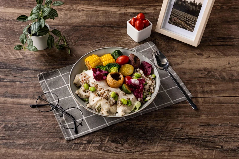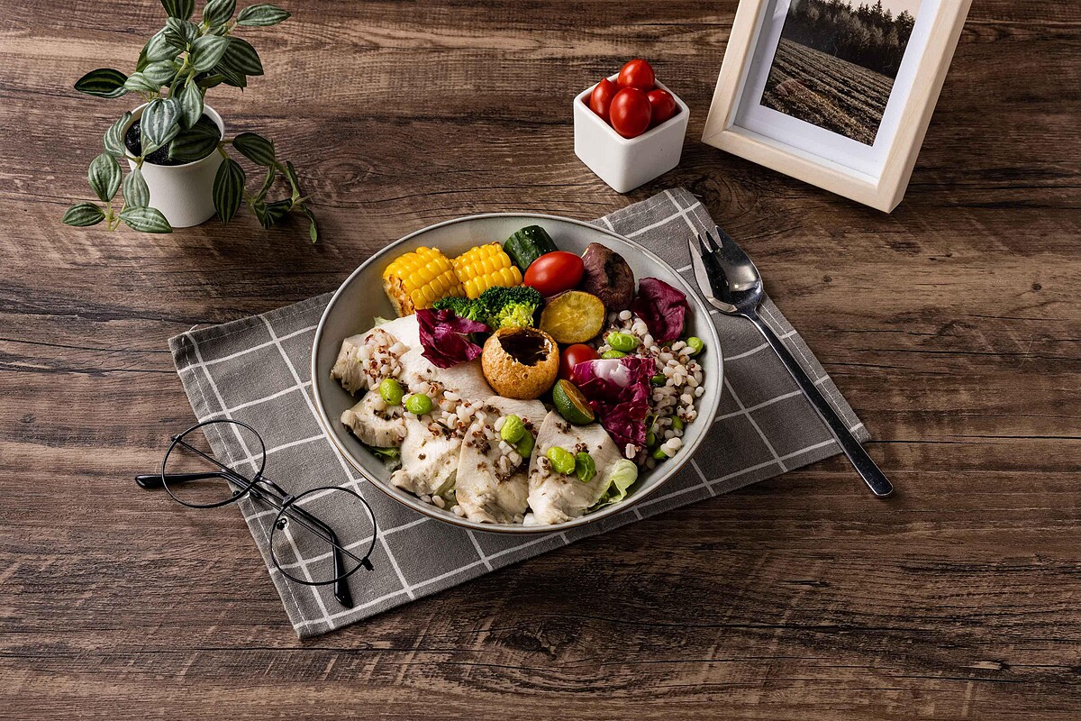 主廚採用法式舒肥低溫烹調技巧,慢煮鮮嫩雞胸肉,搭配義式香草醬汁,口感柔嫩不柴。加入豐富的彩蔬、高蛋白高纖的紅藜麥、大麥仁、毛豆仁,淋上檸檬油醋,並加入印度脆球增添口感層次,讓人食欲大開!