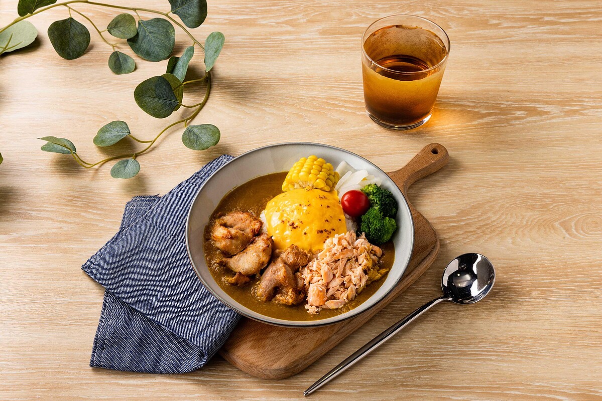 這道料理是以和風洋食為靈感打造,以新鮮嫩烤的鮭魚和雞腿搭配日式咖哩醬汁,經過烤燒後,起司的香氣讓人忍不住口水直流。再搭配青花椰菜、小番茄、玉米等多種蔬菜,每一口都充滿著甘甜風味!