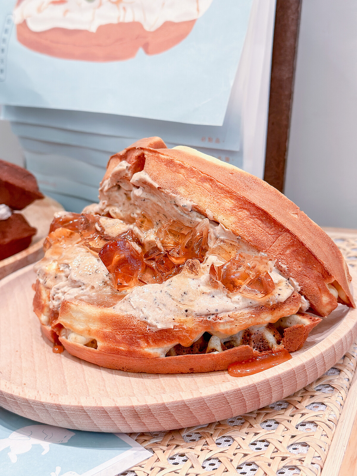 白狐院華夫餅菜單近期推出奶茶季,將經典的生乳雙與多款茶結合,打造出帶有茶香的奶茶霜!這款太妃焦糖奶茶茶雪華夫餅也是人氣必點之一,再厚實的華夫餅上鋪滿濃郁奶茶生乳霜,接著再放上特製的太妃QQ,再淋上誘人的太妃焦糖醬,入口感受又酥又Q的口感,真的太好吃啦!