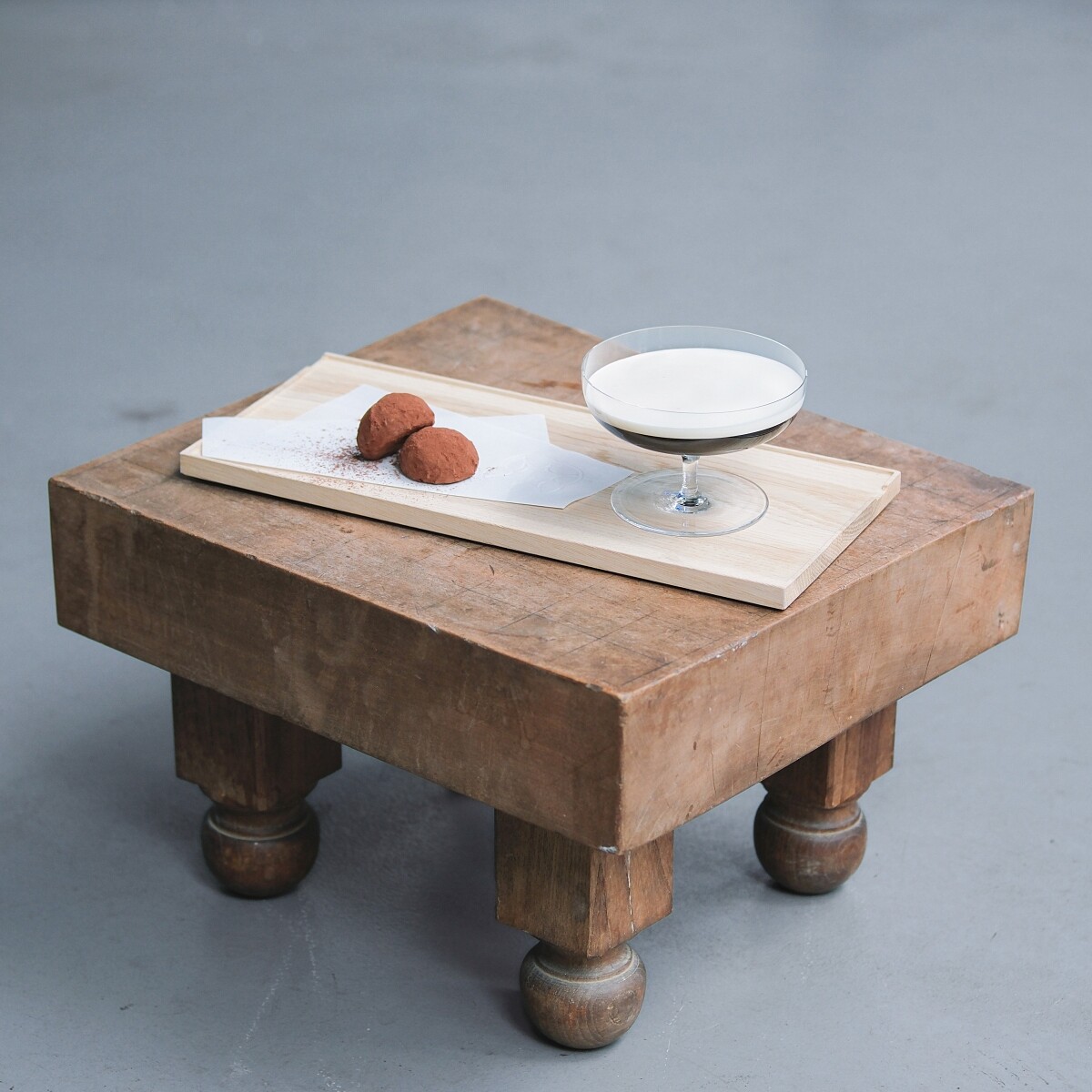 咖啡油脂是可影響香氣的絕對條件,也是所有熱愛咖啡的人一直在追求的事情。第一道即將經典50c.c.黑咖啡油脂分為兩杯,一杯在無降溫狀態直接加入氣泡水中,溫熱的咖啡油脂將氣泡包覆住,因此能保留住大量的香氣,且口感滑順。另一杯則在降溫至十度左右,以純飲一口飲盡,第一杯的香氣與口感會再次重現。搭配的食物則是檸檬內餡的馬卡龍,酸甜的滋味搭配上氣泡咖啡後呈現出百香果的香氣,無論咖啡、餐點兩者都展現了明顯的特色,卻又能互相搭配,嚐來尾韻飽滿且悠長。