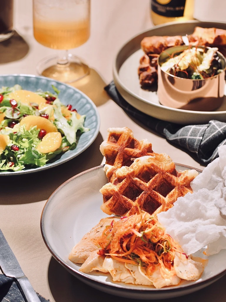 在《勺日》NOKE忠泰樂生活店中的餐點更為豐富,菜單中更精心計劃充滿下午茶感的晚餐餐點,輕盈、無負擔,晚餐菜單預計將會在6月1號在雙店正式登場,推薦大家試試雲飄飄韓式辣拌菜佐雞胸可頌鬆餅」與美式起士肉醬、義式青醬牛肚等開胃精緻的醬料。