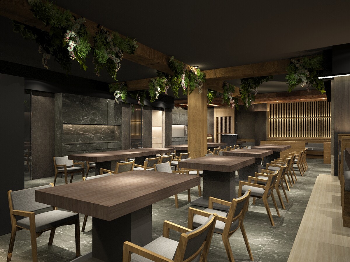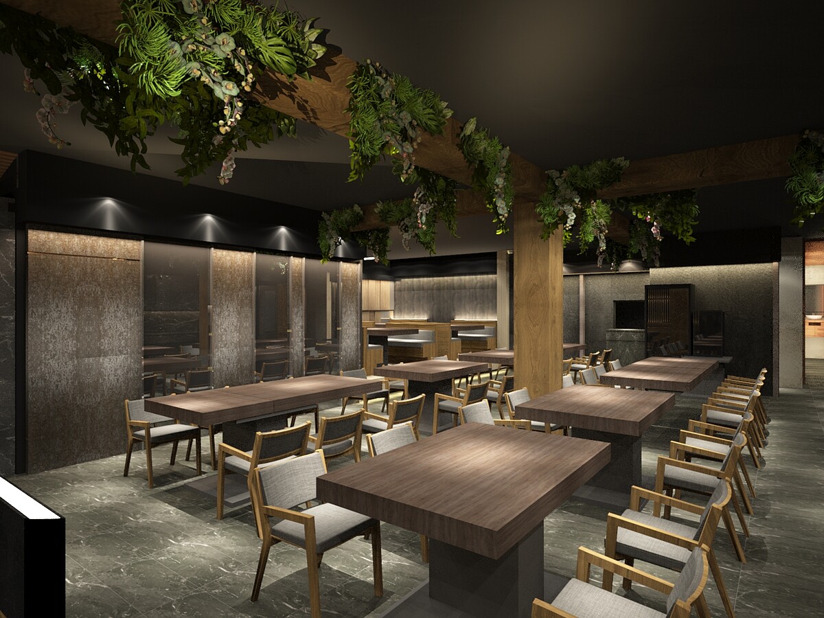 《NAKAMA》店面就在《絵馬別邸》的二樓,以大片垂落植栽為幕、花崗石材為骨,透過拉門隔出隱密的私人空間,共規劃了84個席次,有開放式與半開放式的包廂座位。