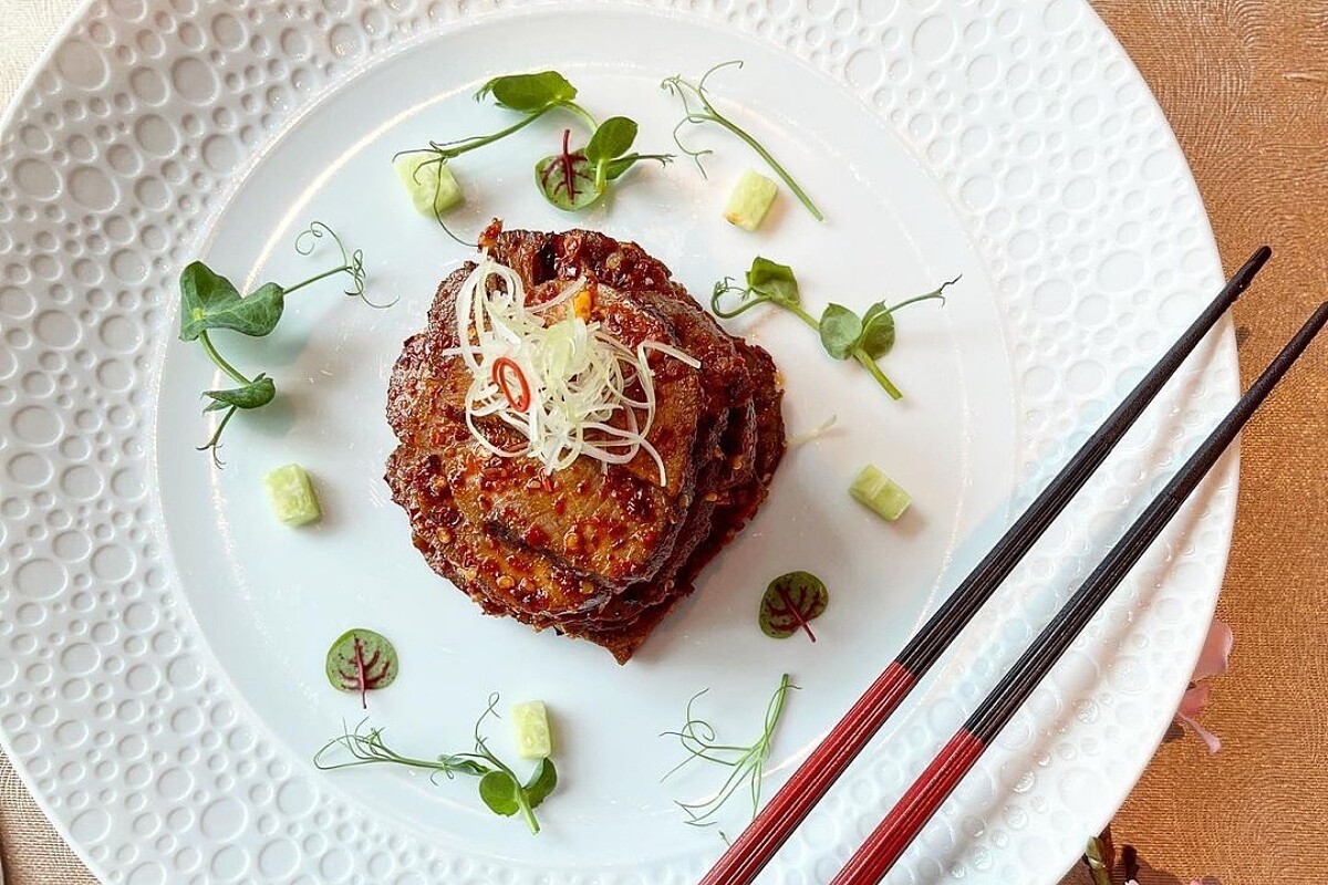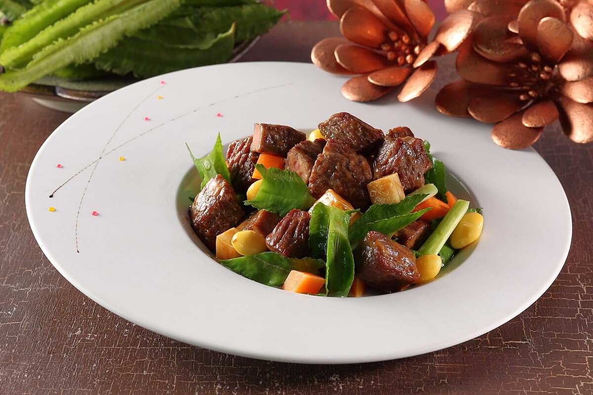 此為蔥爆牛肉的升級版,內有歐洲進口清甜的韮蔥,以及脆口的翼豆,主廚更放入韓國年糕成為此道料理中的驚喜食材。將頂級澳洲9+級黑毛和牛牛小排切成易入口的骰子狀,與蒜蓉、薑片、翼豆、白果、蔥段拌炒,再以老抽、蠔油、紹酒調味,和牛肉的香滑油嫩與蔬果的清脆、年糕的彈糯建構成多重的口感。