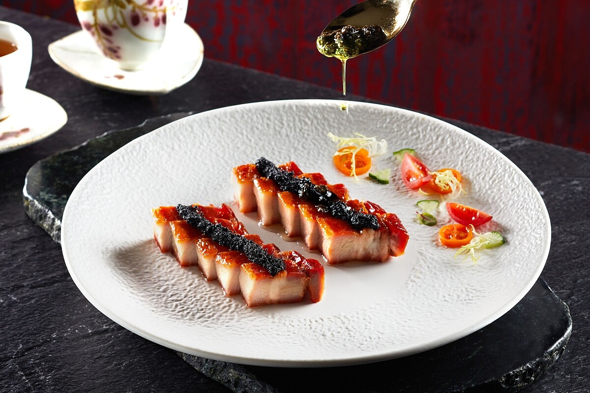 叉燒是廣東料理中最經典的大眾美食,望月樓這回捨棄偏瘦肉質,改用「半肥瘦」的五花肉。此道料理由港籍燒臘主廚伍來勝操刀,取帶皮五花肉加入豐富的醃料,包括提香的紹酒和去腥的米酒、保持肉質軟嫩的雞蛋,增添其醬香的芝麻醬、磨豉醬、海鮮醬和賦予叉燒顏色的南乳醬,待材料完全入味後透過主廚高超的用火技巧以火烤熟,並完美做到邊緣烤焦香的效果,最後以完美的焦糖化並增添火烤香氣才算完成。 上桌前則有去皮再切成一吋厚度的工序,才淋上主廚調整過的義大利松露醬,腴潤甜香的叉燒,與外皮醬香、松露獨特的香氣交織融合成最華麗的滋味。