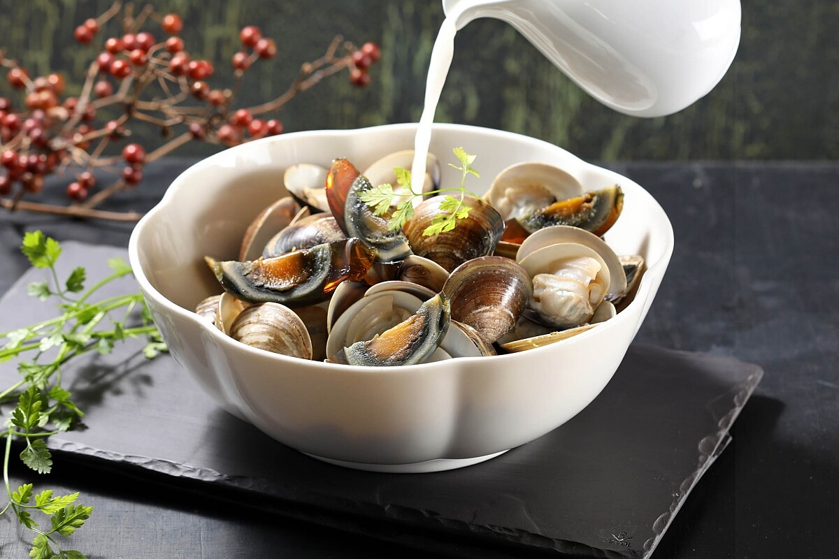 有別於原始的清水湯底,主廚改用費工煮製的鯽魚湯,風味更勝一籌!鯽魚湯一定要每天現煮,隔夜就有腥味,魚先煎香,再以魚、水一比一的分量,簡單加上薑、鹽、胡椒,大火熬煮半小時,魚身碎裂也釋放足夠的膠質,湯色奶白濃郁。取魚湯加入皮蛋、香菜和鮮活的嘉義文蛤,略加調味,用小火掌握火候煮至蛤蜊開口即可,湯鮮料美,讓人回味無窮。