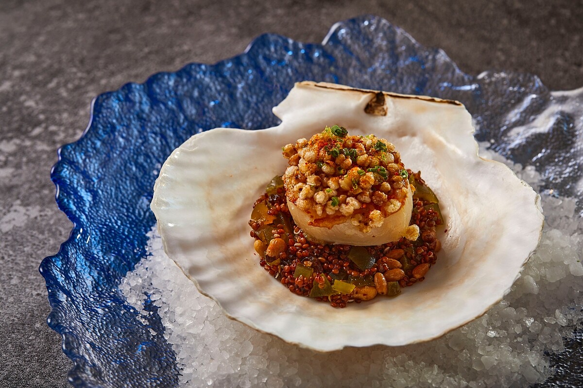 以西班牙常見的海鮮藜麥燉飯搭配為靈感。主廚先將特級北海道干貝經油煎,酥香的外皮完美鎖住濃郁多汁的干貝原味,與經過 昆布高湯烹煮過的藜麥相互呼應,連同酸豆、松子、蕎麥與葡萄 乾等多種地中海常見乾果一同均勻攪拌,在堅果清香味中增添了 高雅的海味。酥脆又軟糯、綿密而 Q 彈的豐富口感在舌尖交會, 是一道向侯布雄(Joël Robuchon)料理致敬的新意之作。
