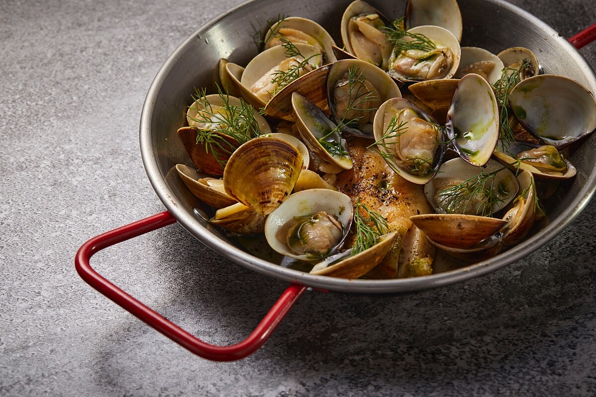 這道來自巴斯克地區的傳統料理,是當地最常見的海鮮料理方式,現撈活海鮮以炭烤方式烹調,簡單而直接地保留來自大海餽 贈的天然美味。 主廚選用骨細刺少的台灣午仔魚入菜,肉質細緻、油脂豐富的魚 肉先煎後烤至表皮金黃,搭以白酒蛤蠣與橄欖油小火炒製的醬 汁,澆淋上秘製的翠綠蒔蘿油醋,白綠相間的層次細膩、風味別 緻清新,令人為之驚艷。
